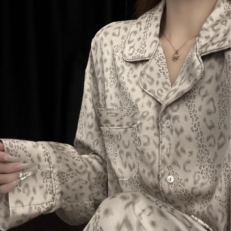 韓国風高級感レオパード柄アイスシルクパジャマ レディース 春秋新作 アイスシルク長袖長ズボンルームウェア 上下セット