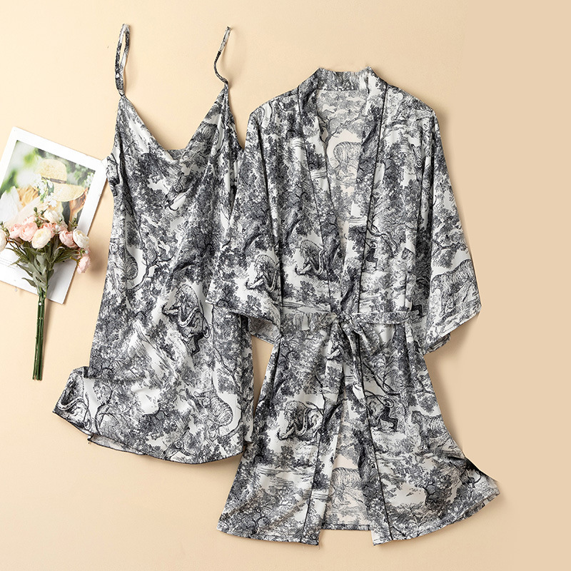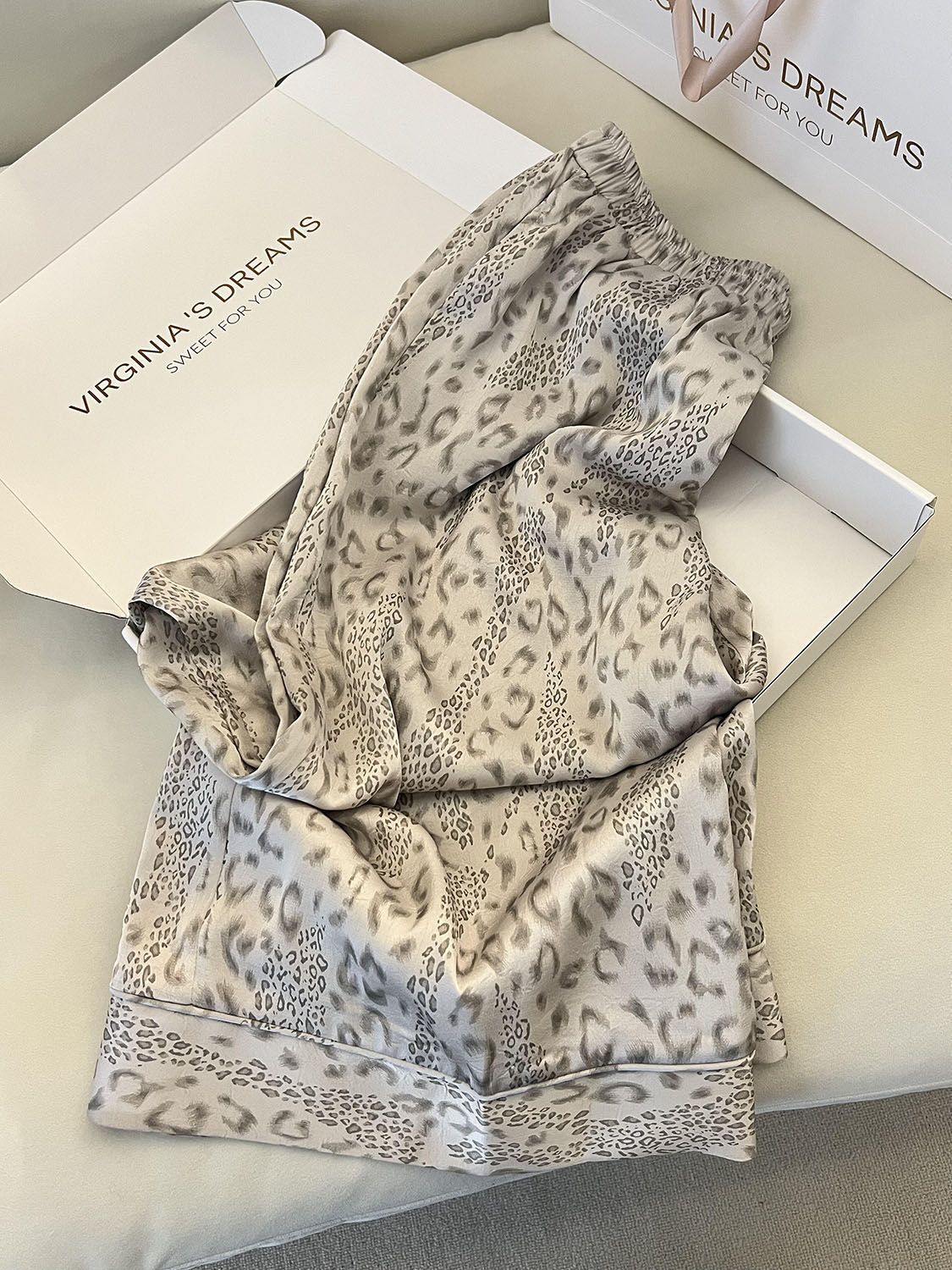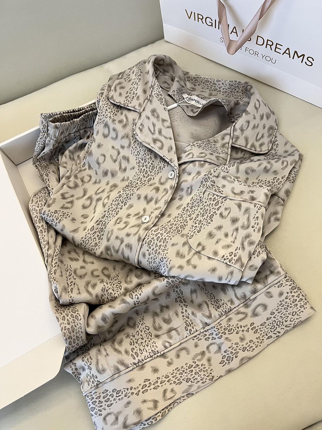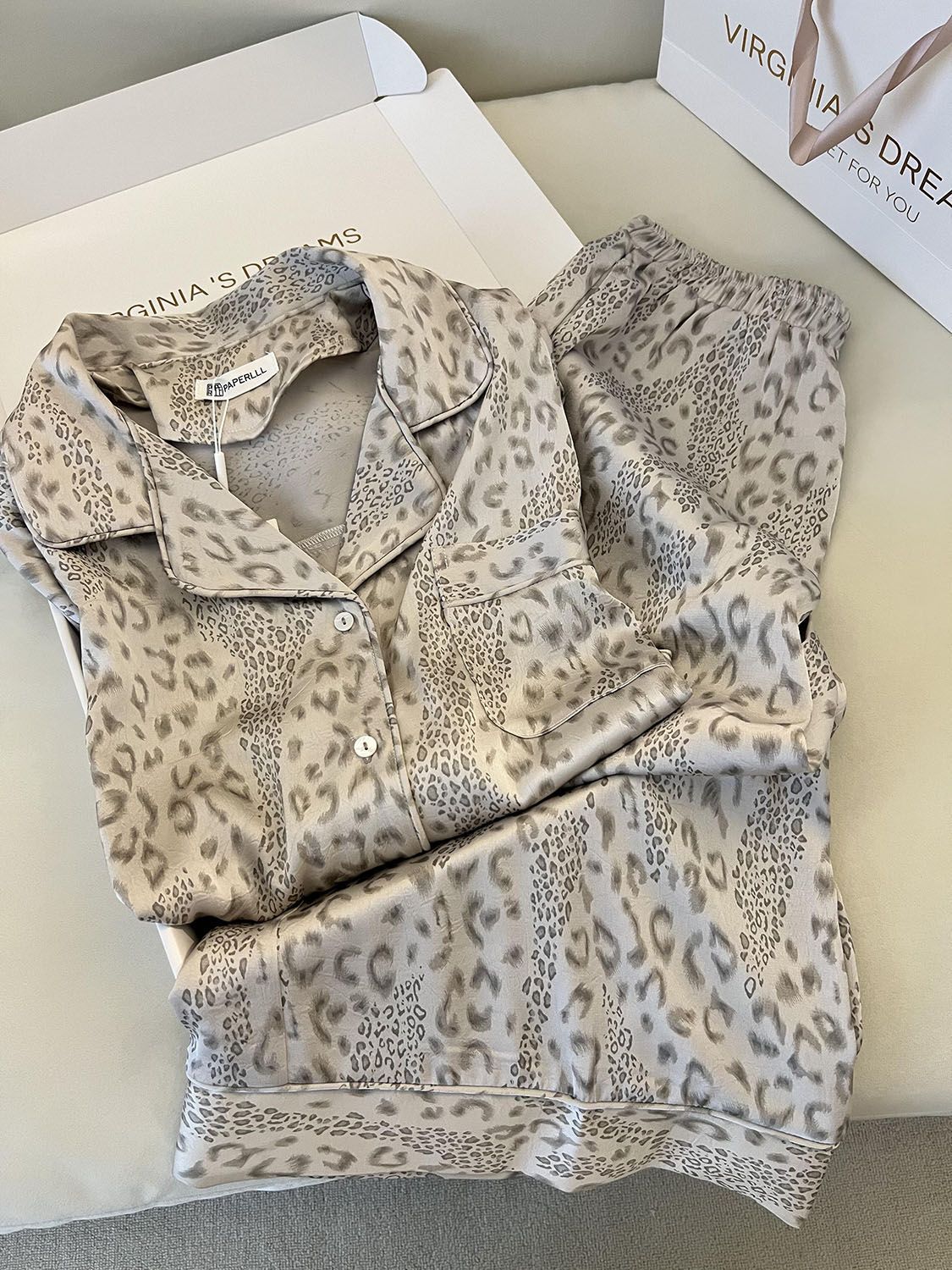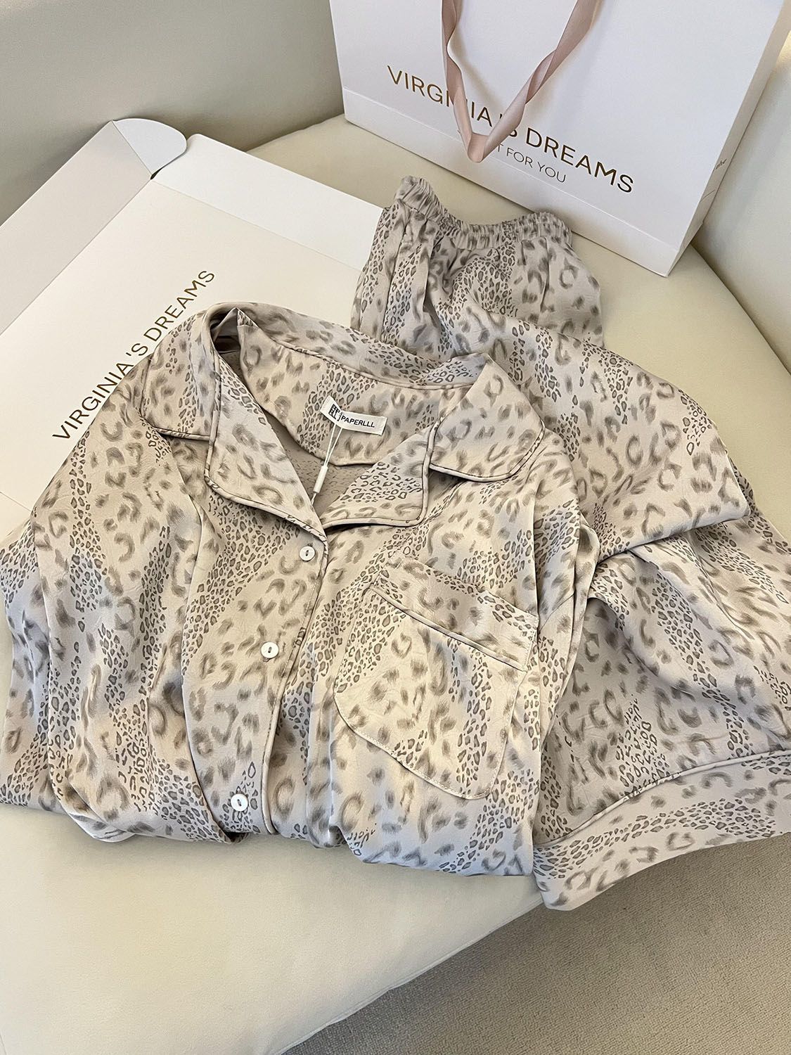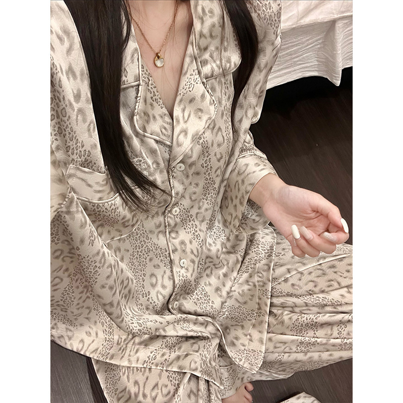 豹纹休闲风春秋季透气新款冰雪丝绸长袖长裤开衫睡衣女士家居服