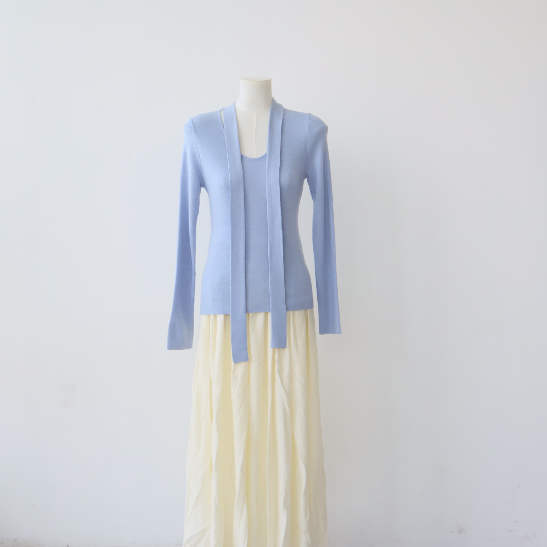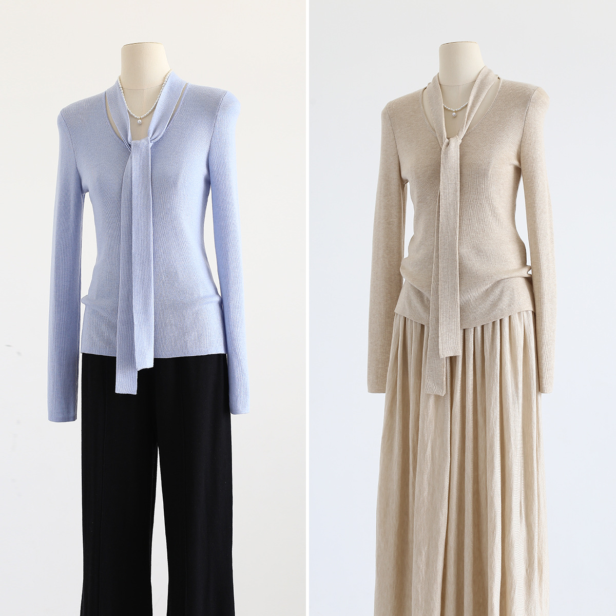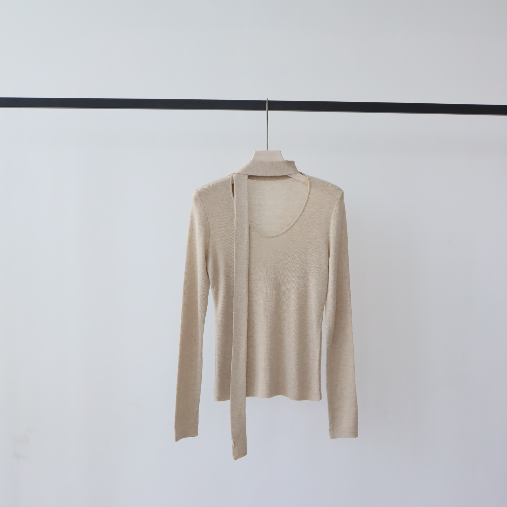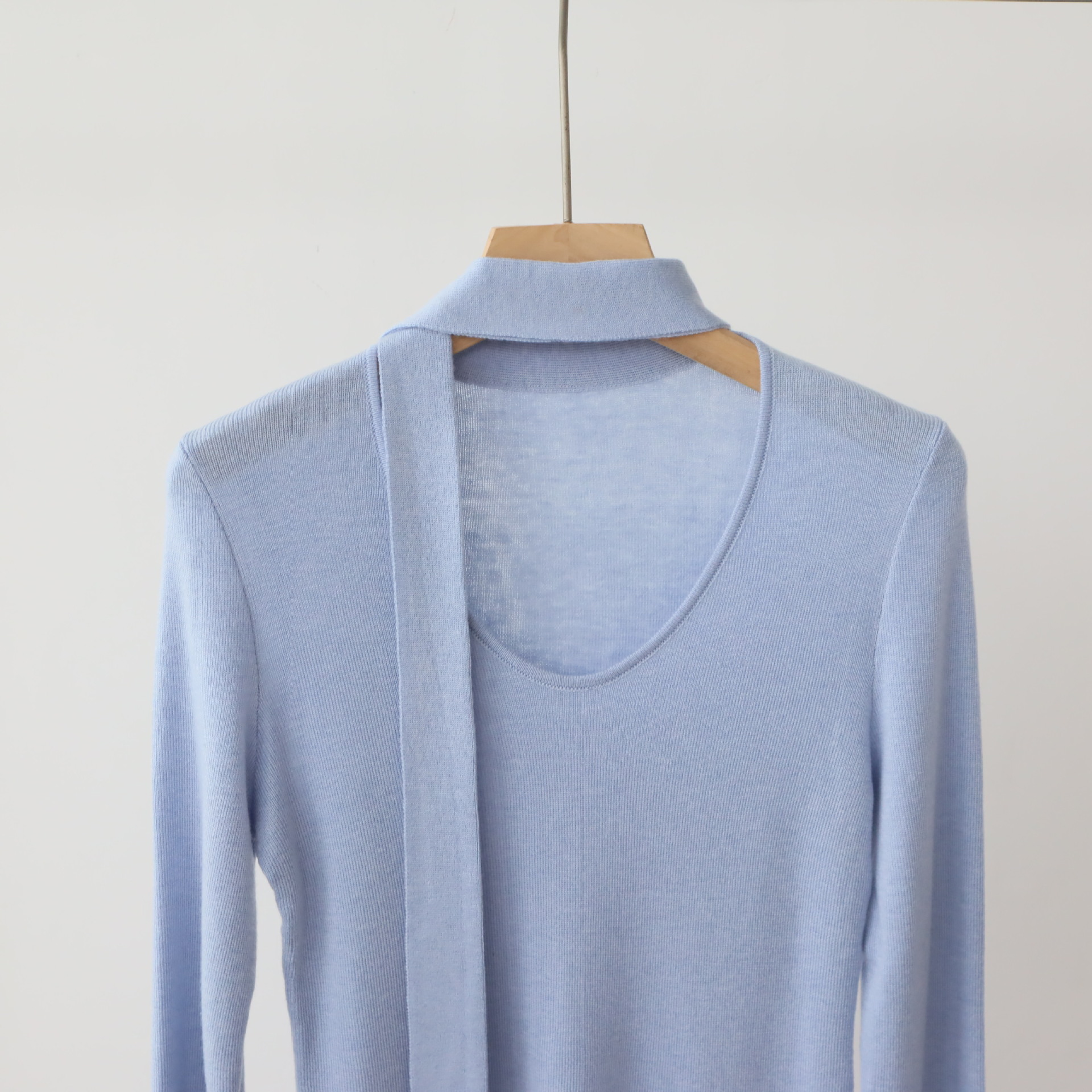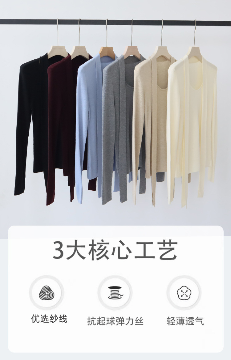 十三行女装早秋穿搭高级感羊毛混纺针织衫设计感飘带围巾领上衣女