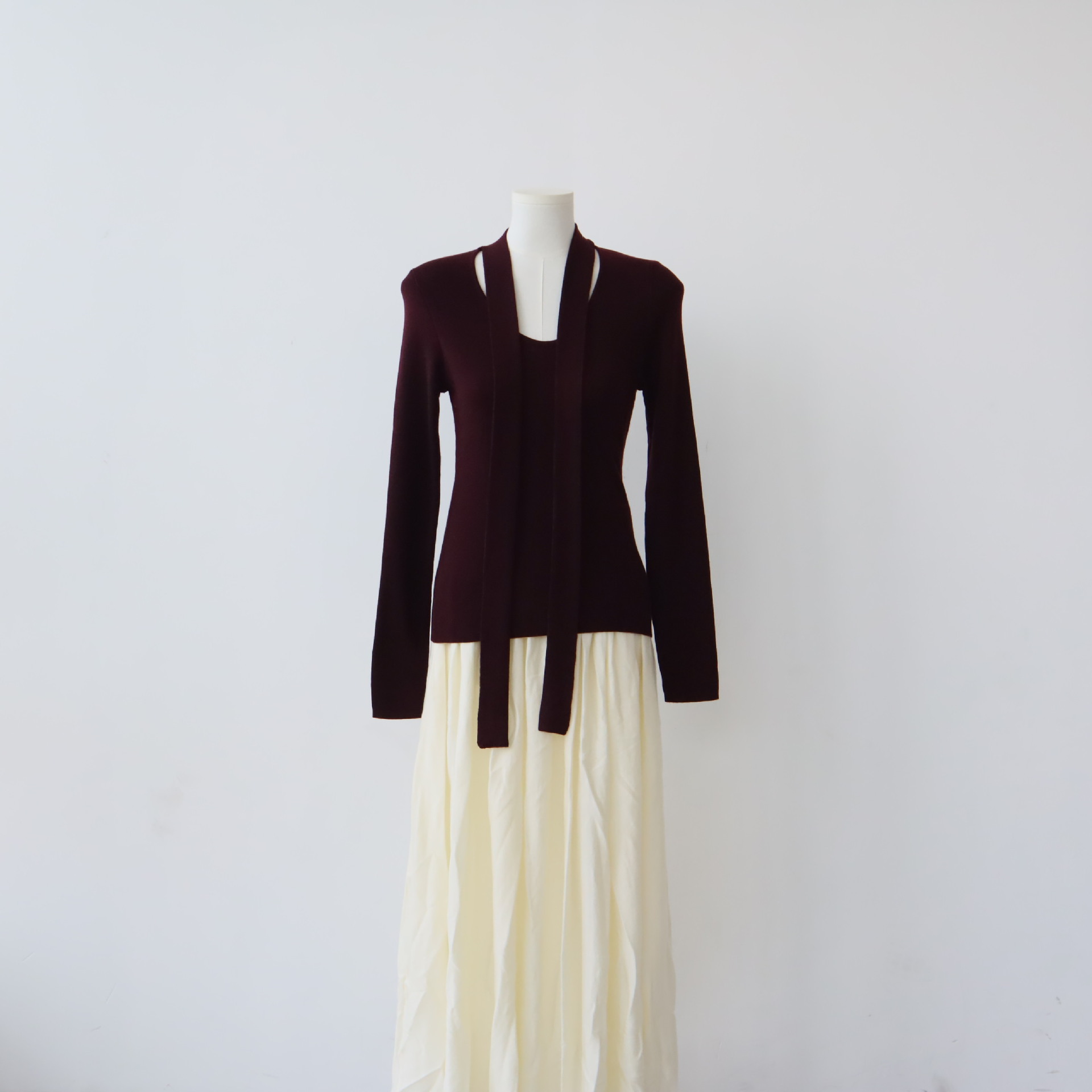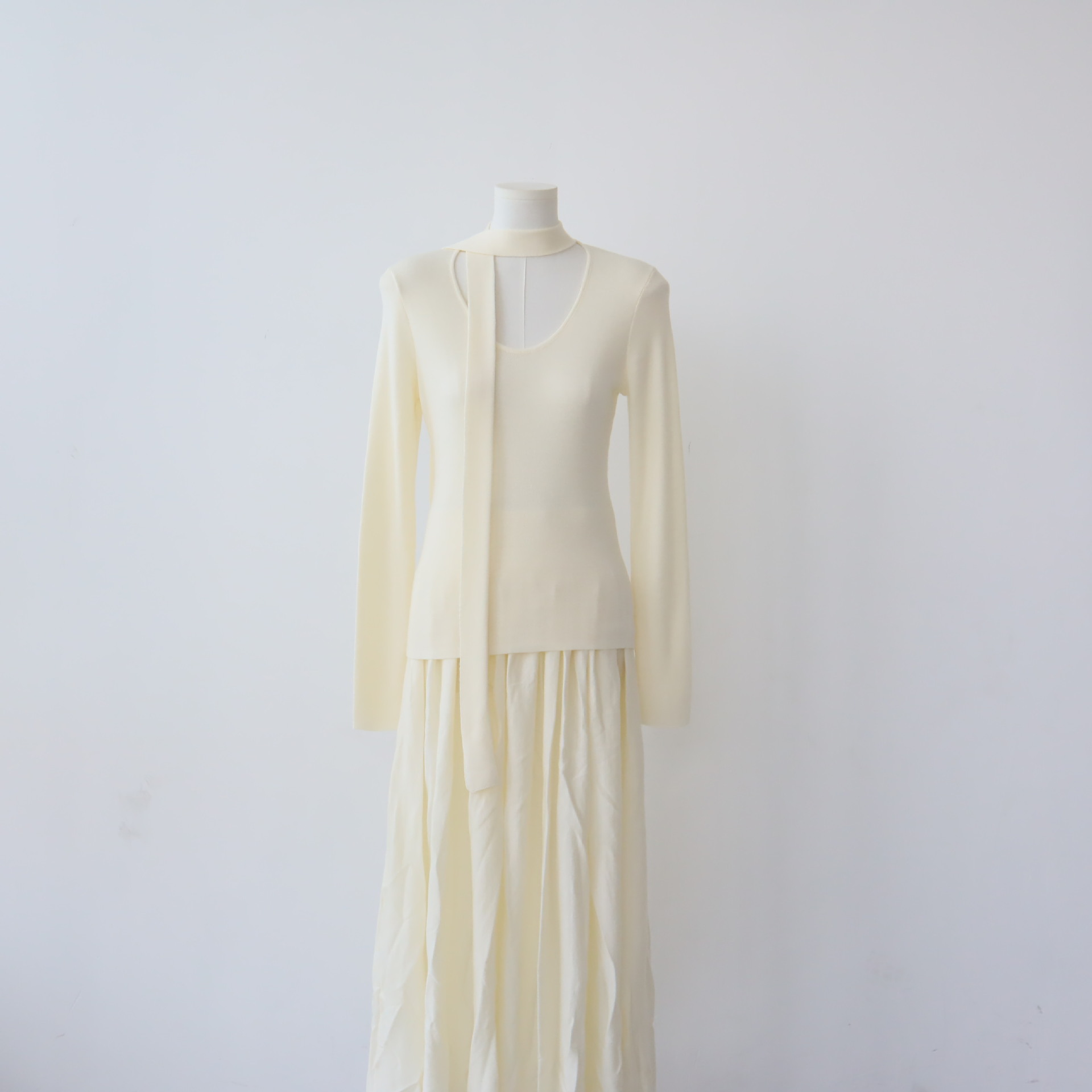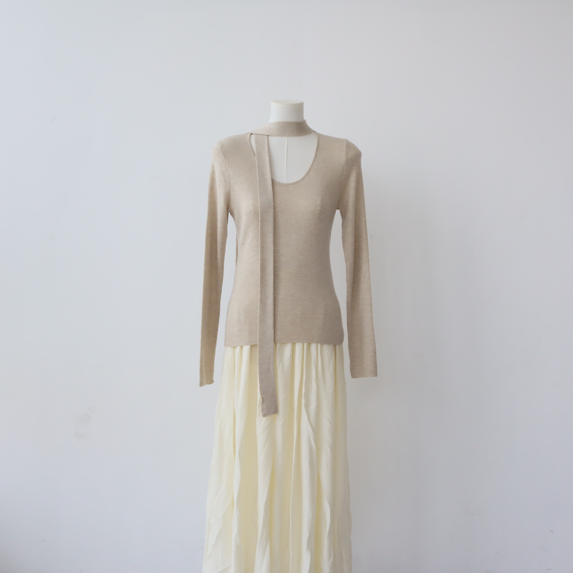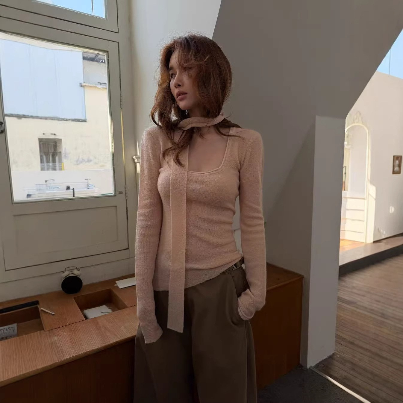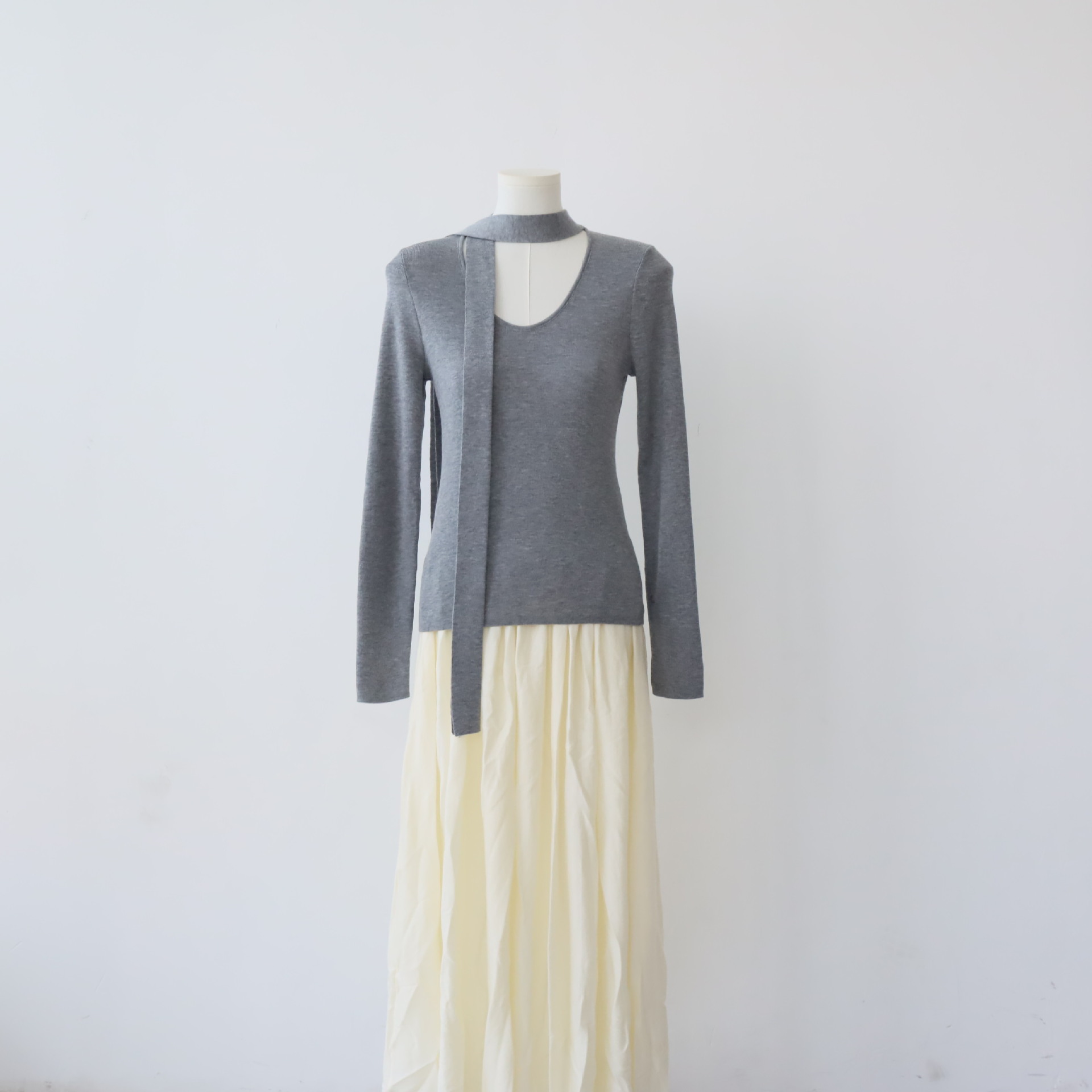 十三行女装早秋穿搭高级感羊毛混纺针织衫设计感飘带围巾领上衣女