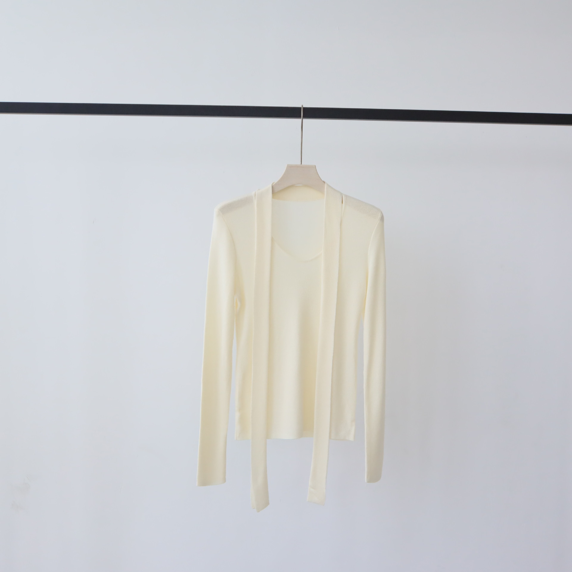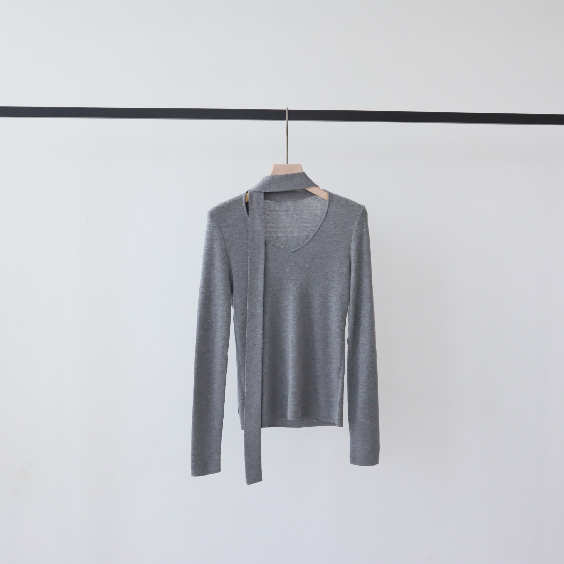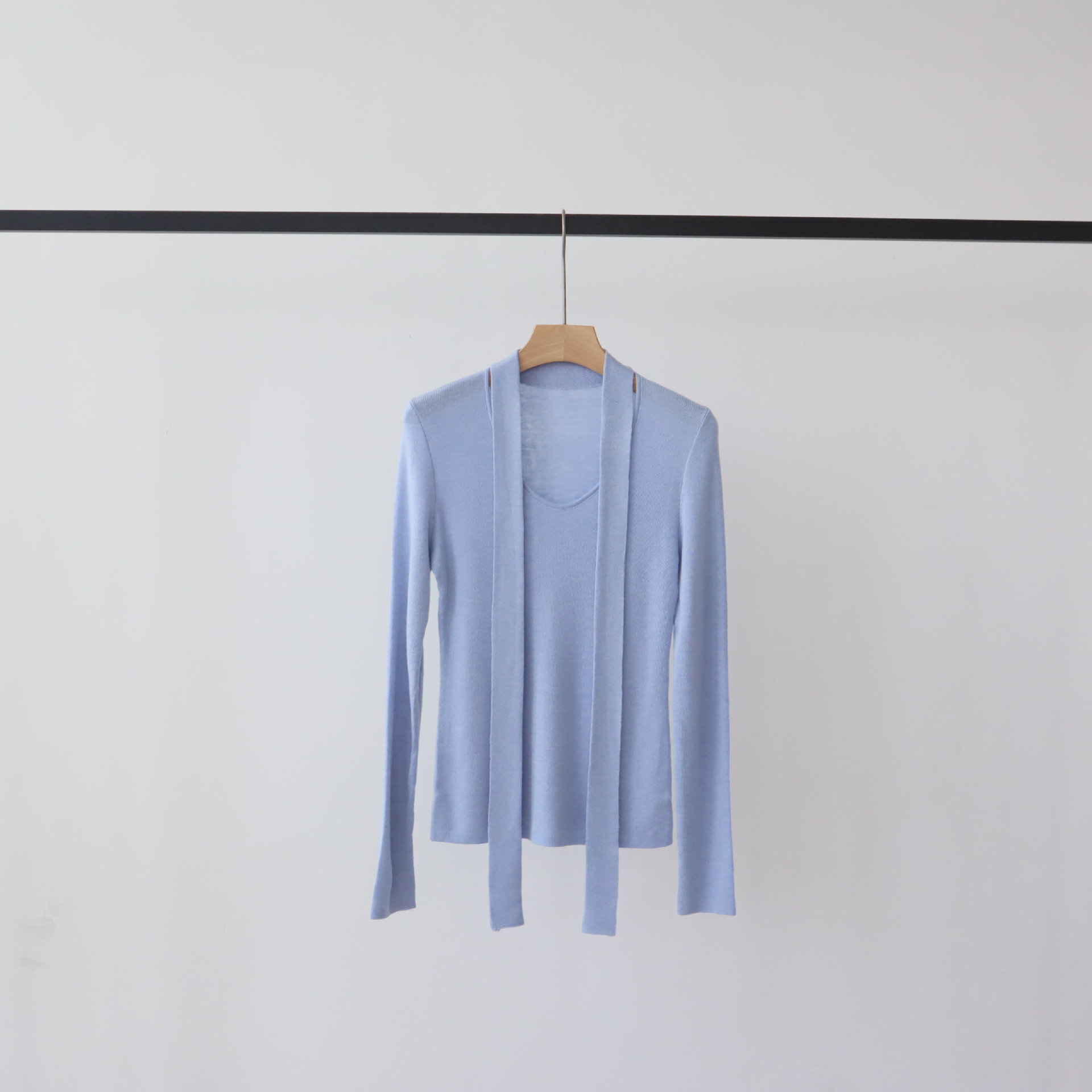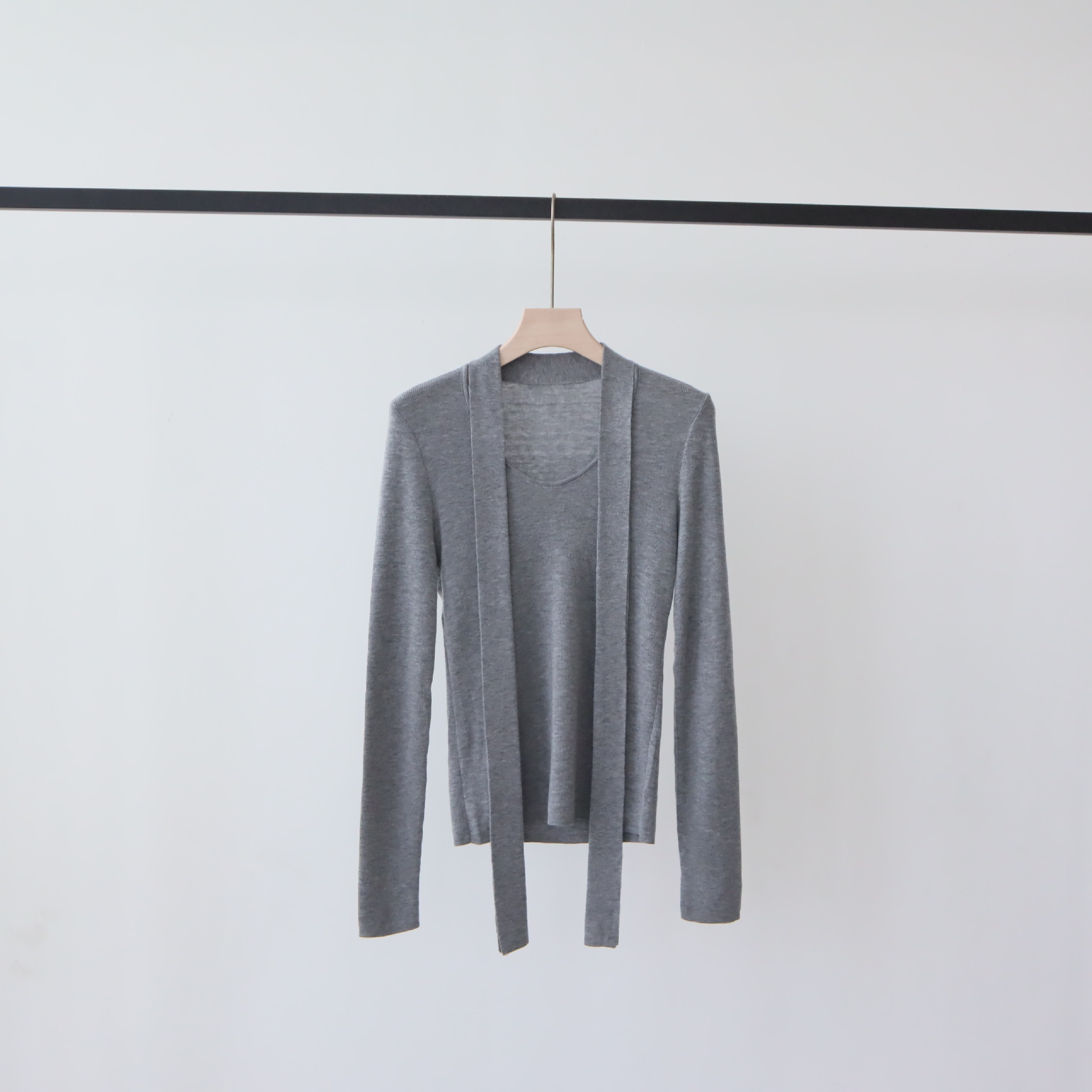十三行早秋穿搭羊毛混纺针织衫长袖外搭设计感带飘带上衣女打底衫