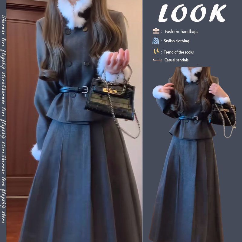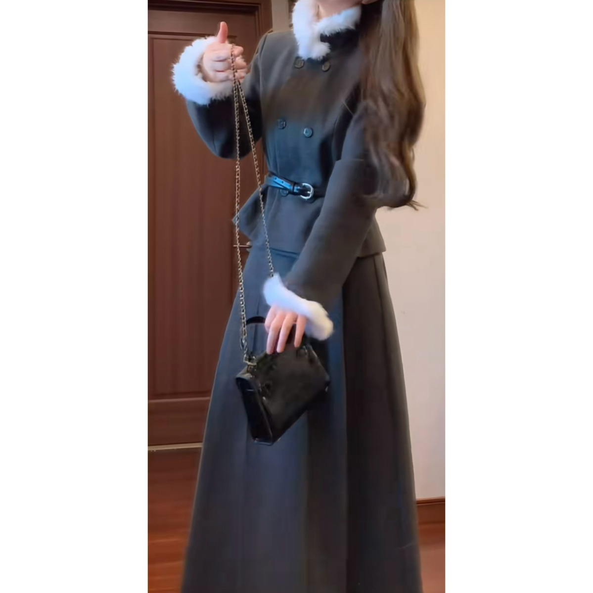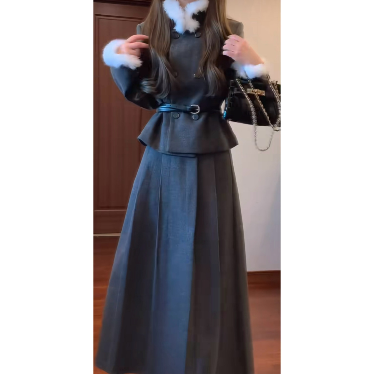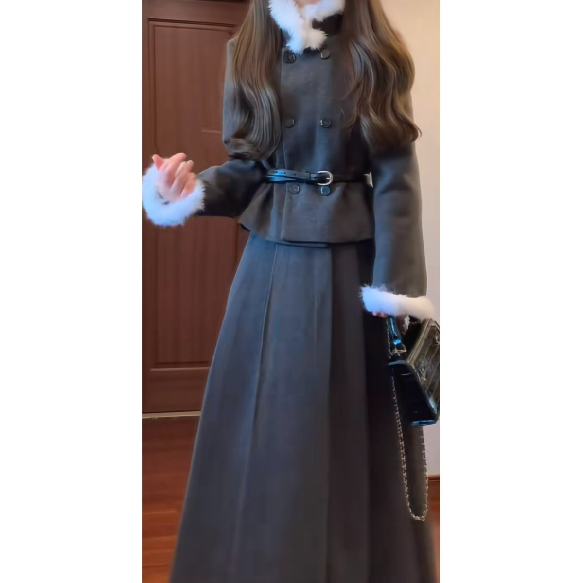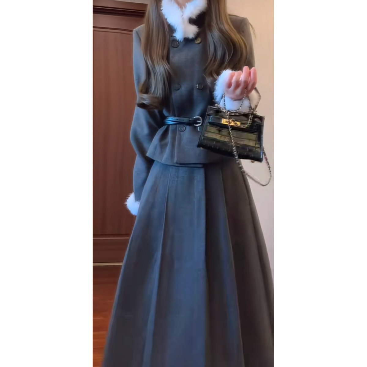 财阀韩系气质千金毛领双排香风外套秋冬季新款高腰百褶半身裙套装