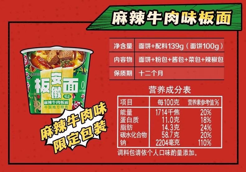 包装规格 【共2桶】香辣牛肉+卤香牛肉,【带点辣味】卤香牛肉面*2,【微辣就好】香辣牛肉面*2,【特能吃辣】麻辣牛肉面*2,【加麻加辣】泡椒牛肉面*2,【共2桶】泡椒牛肉+麻辣牛肉,【共4桶】4口味混合(可备注),【共6桶】4口味混合(可备注),【共8桶】4口味混合发出(可备注),【共4桶】卤香牛肉*2+香辣牛肉*2,【共4桶】卤香牛肉*2+泡椒牛肉*2,【共4桶】麻辣牛肉面*4,【共4桶】泡椒牛肉面*4,【共4桶】香辣牛肉面*4,【共4桶】卤香牛肉面*4,【共6桶】麻辣牛肉面*6,【共6桶】泡椒牛肉面*6,【共6桶】香辣牛肉面*6,【共6桶】卤香牛肉面*6,【共8桶】麻辣牛肉面*8,【共8桶】泡椒牛肉面*8,【共8桶】香辣牛肉面*8,【共8桶】卤香牛肉面*8