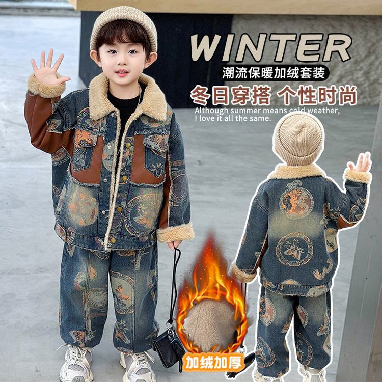 男童冬装加绒牛仔套装韩版儿童加厚潮款两件套中小童帅气衣服男孩