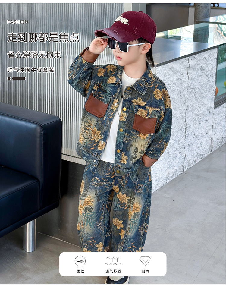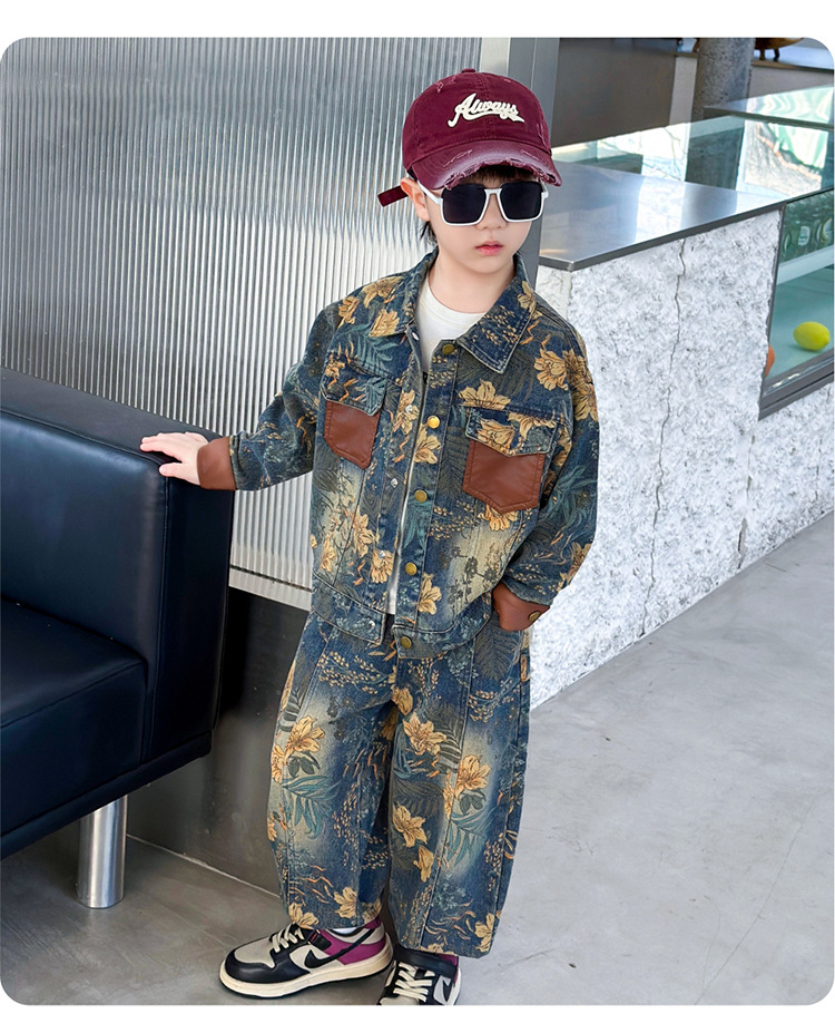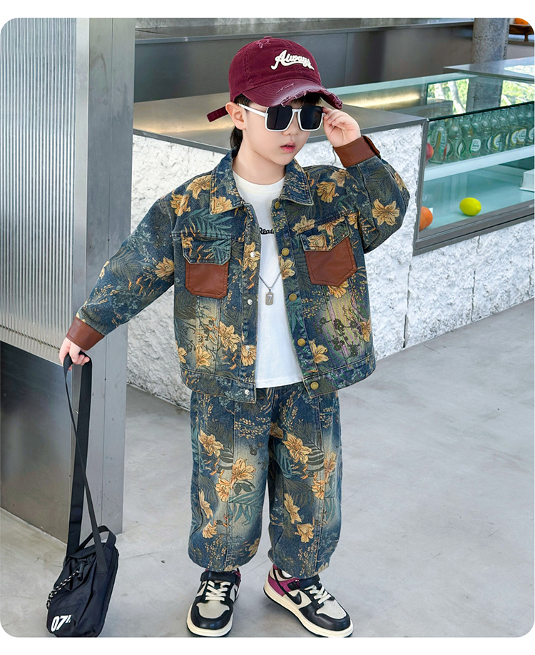 男の子用染め加工デニムセット 2026年春秋新作 子供用おしゃれでトレンディなツーピースセット 小中型子供服 クール