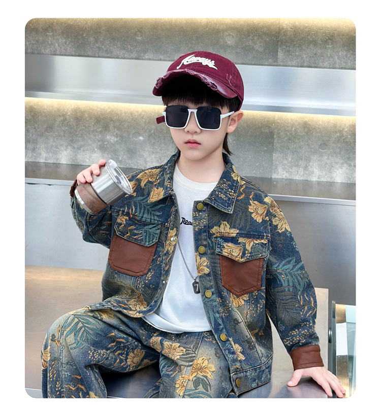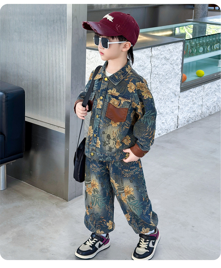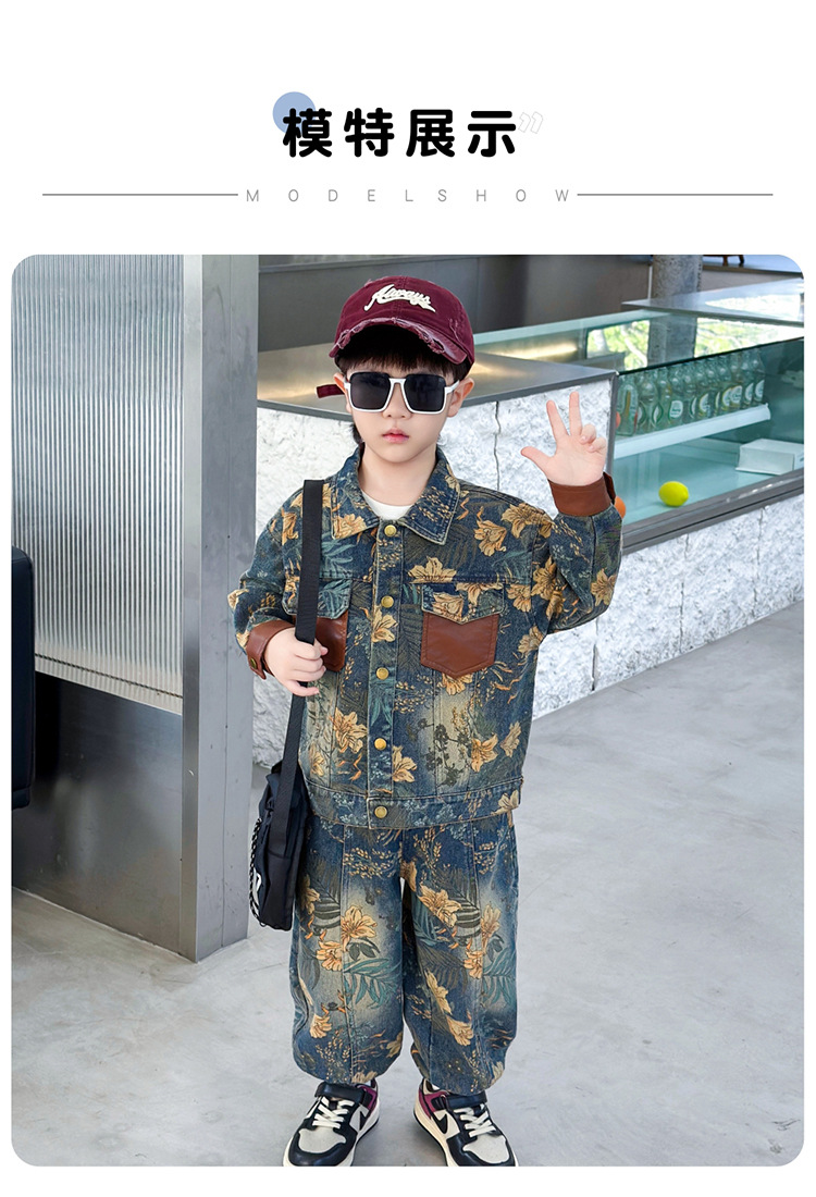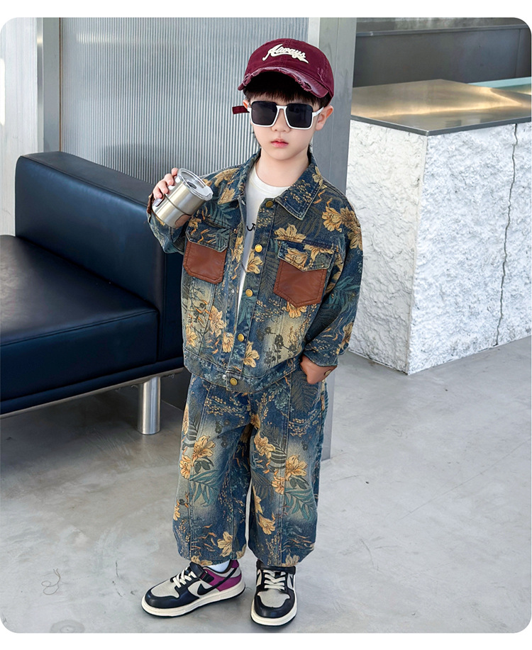 男の子デニムスーツ2026春秋新作子供無地トレンディクールツーピースセット幼児服海外販売