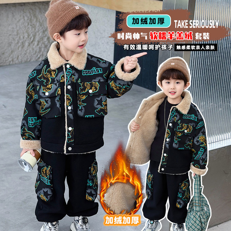 男童冬装加绒牛仔套装韩版儿童帅气潮款加厚两件套中小童外贸童装