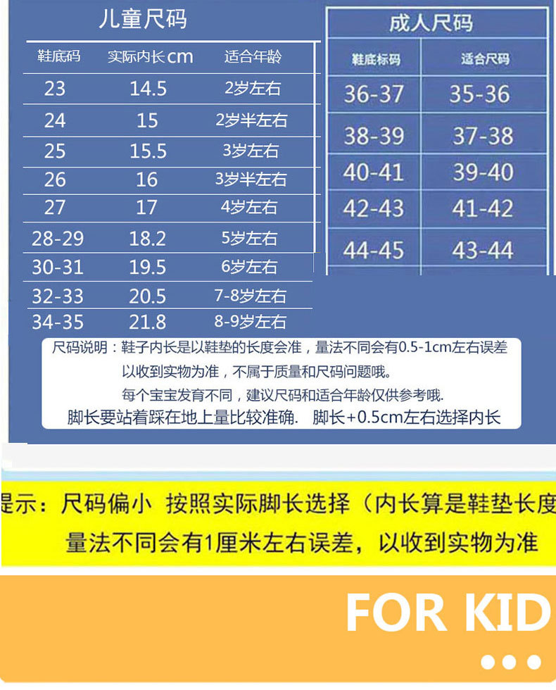 童袜尺码 儿童23码内长14.5cm,儿童24码内长15cm,儿童25码内长15.5cm,儿童26码内长16cm,儿童27码内长17cm,儿童28-29码内长18.2cm,儿童30-31码内长19.5cm,儿童32-33码内长20.5cm,鞋底34-35适合34-35