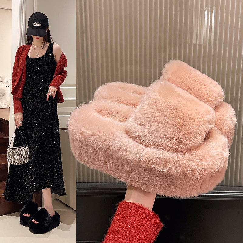 女性のアウターウェア用のハイエンドのハイヒールの毛皮のようなスリッパ、2025秋冬の新しいスタイルのホーム高揚厚い底の豪華な綿のスリッパ