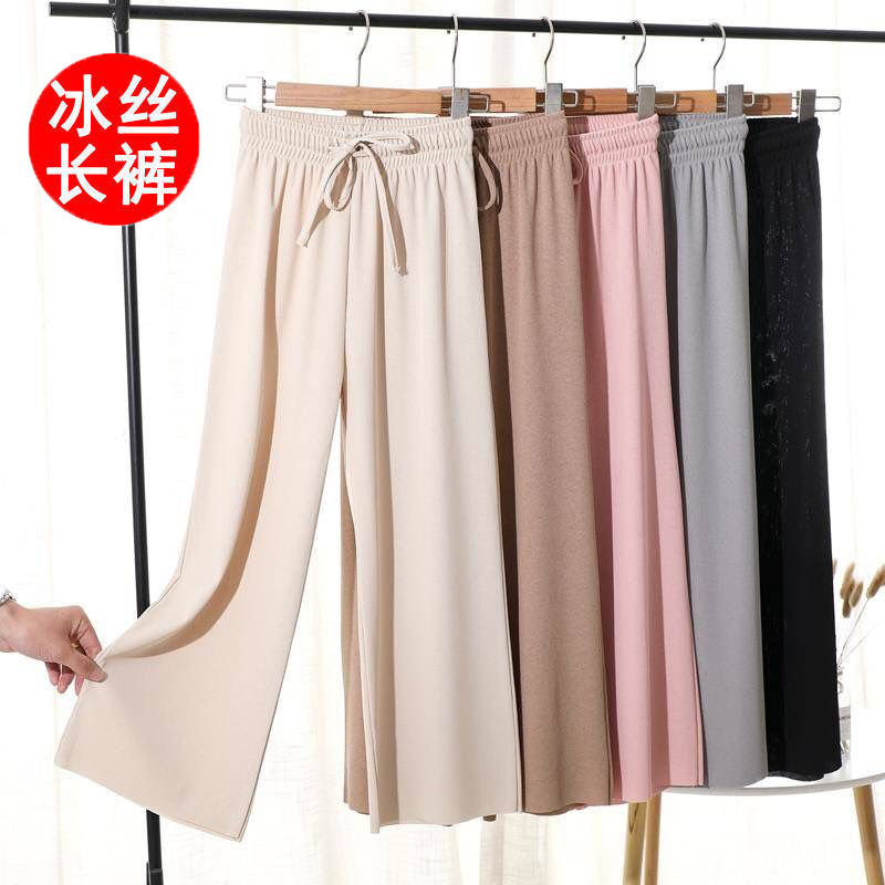 2023春の新型のひもの氷の糸の広い足のズボンの薄いタイプの高い腰の垂れ下がっている感じの百合はやせてゆったりしているストレートのカジュアルなズボンを現します。