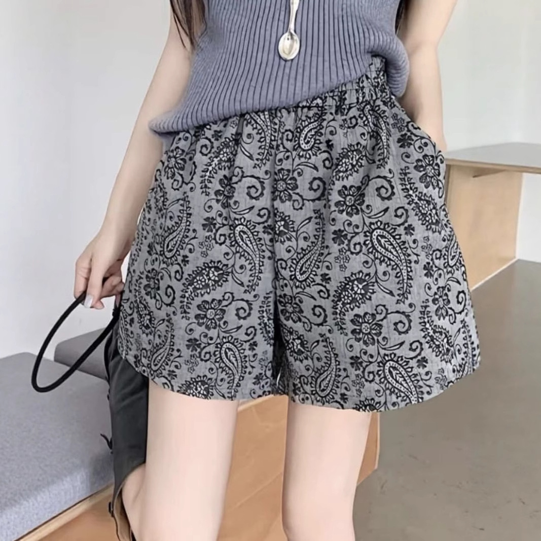 女性用青と白のショートパンツ、夏のハイウエスト、ゆったりと多用途、カジュアルな5点パンツ、ホットガールアイスシルクプリントワイドレッグAラインパンツ