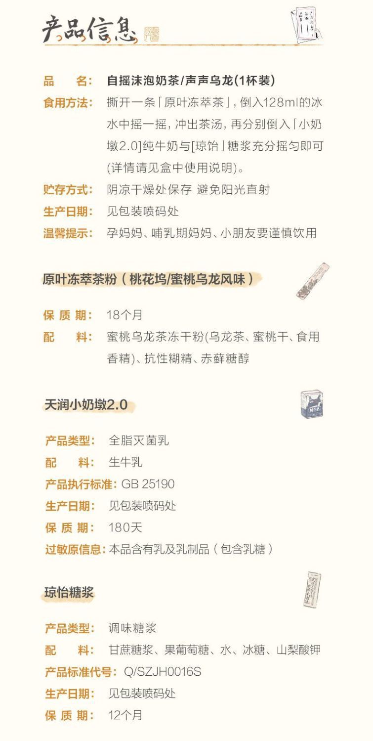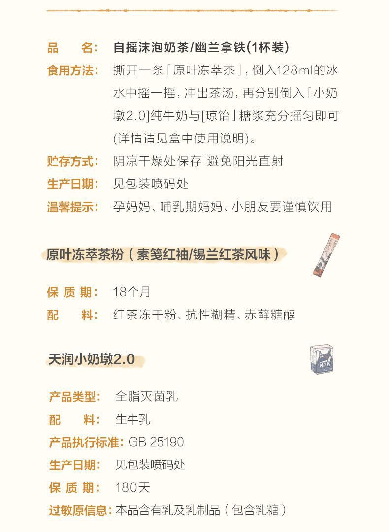 包装规格 幽兰拿铁1杯装*1盒,声声乌龙1杯装*1盒,幽兰拿铁1杯装*2盒,声声乌龙1杯装*2盒,幽兰拿铁*1盒+声声乌龙*1盒 共2杯