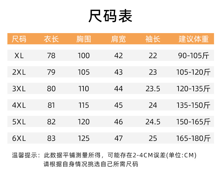 尺码 XL【建议90-105斤】,2XL【建议105-120斤】,3XL【建议120-135斤】,4XL【建议135-150斤】,5XL【建议150-165斤】,6XL【建议165-180斤】
