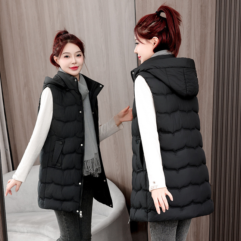 2025 秋冬新作韓国スタイルルーズミッドレングスコットンベスト女性用厚く暖かいフード付きコットンベストジャケット