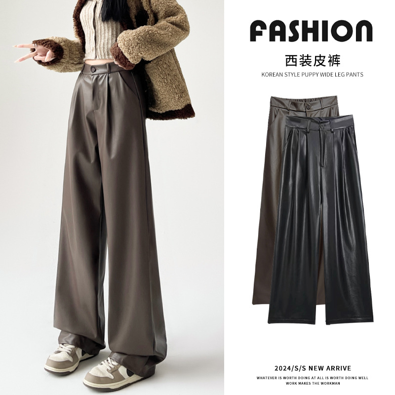 女性の2025年春秋の新しいスタイルの黒のハイエンドのルーズカジュアルなハイウエストスリムワイドレッグナローバージョンのスーツレザーパンツ