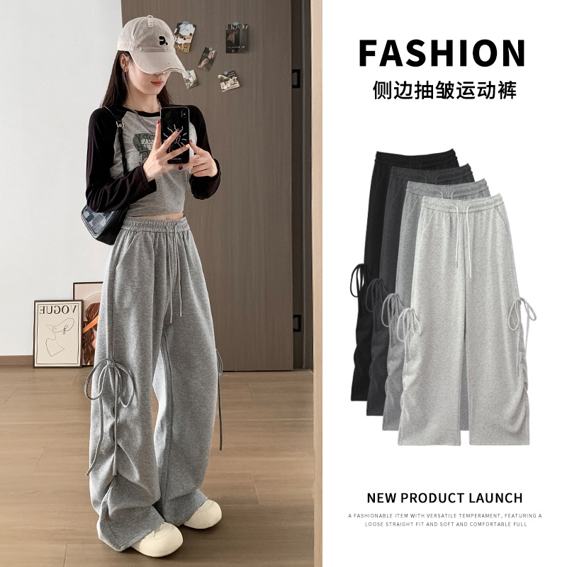 美式复古侧边抽皱蝴蝶结运动裤女春秋宽松显瘦直筒裤休闲阔腿卫裤