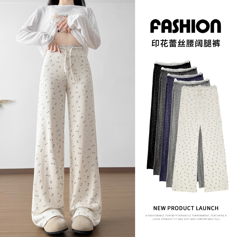 蕾丝腰拼接休闲碎花阔腿裤女春秋设计感高腰垂感显瘦拖地直筒长裤