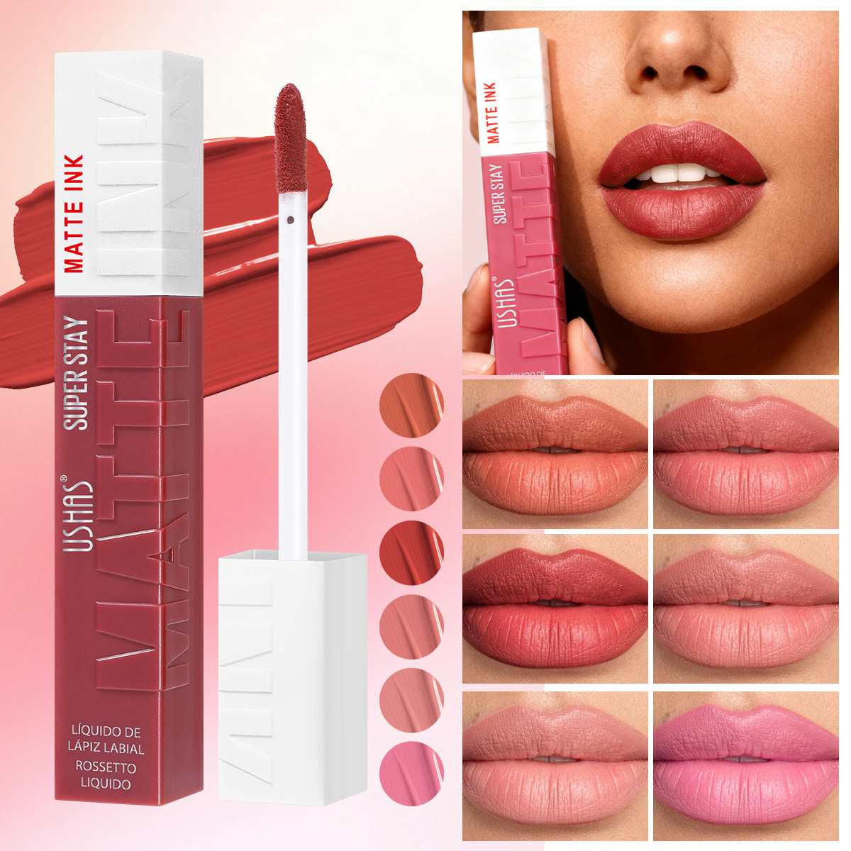 USHASクロスボーダースポットには、ゴールドのパッケージボックス、マットリップスティック、リップライナー、長持ちする防水ヌードリップスティックカラーが含まれます。