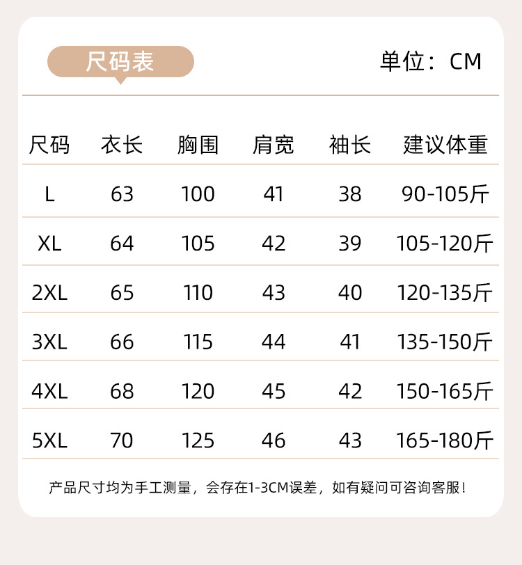 尺码 L【建议90-105斤】,XL【建议105-120斤】,XXL【建议120-135斤】,3XL【建议135-150斤】,4XL【建议150-165斤】,5XL【建议165-180斤】
