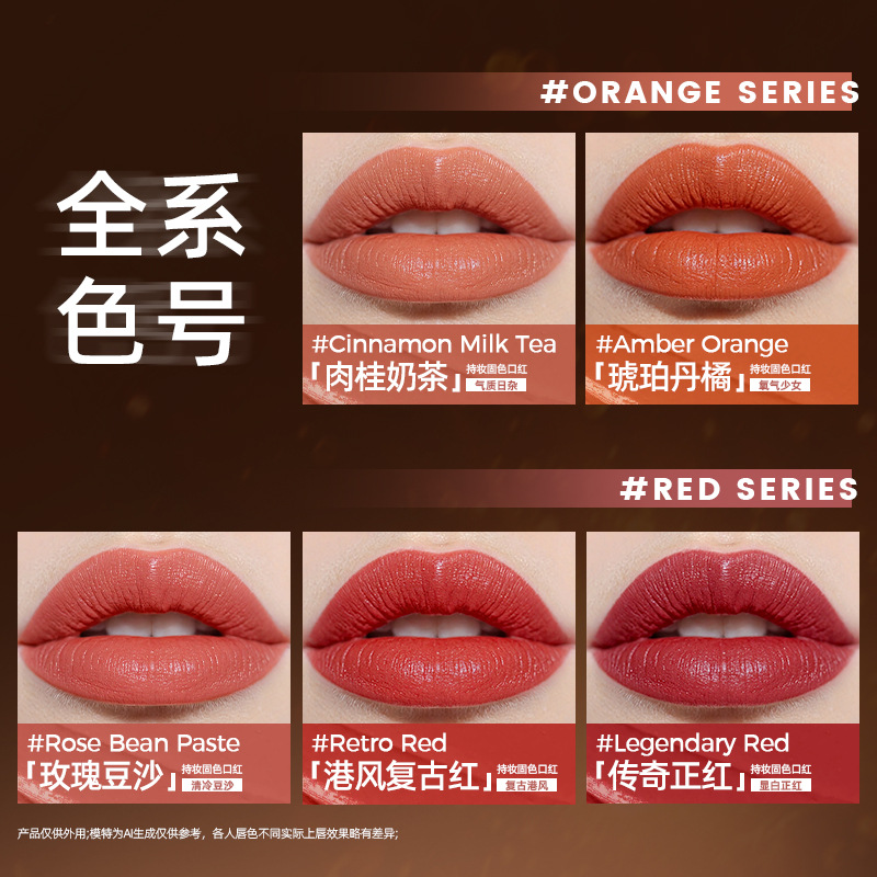 颜色 玫瑰豆沙,传奇正红,琥珀丹橘,港风复古红,肉桂奶茶