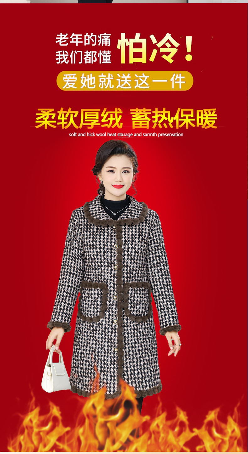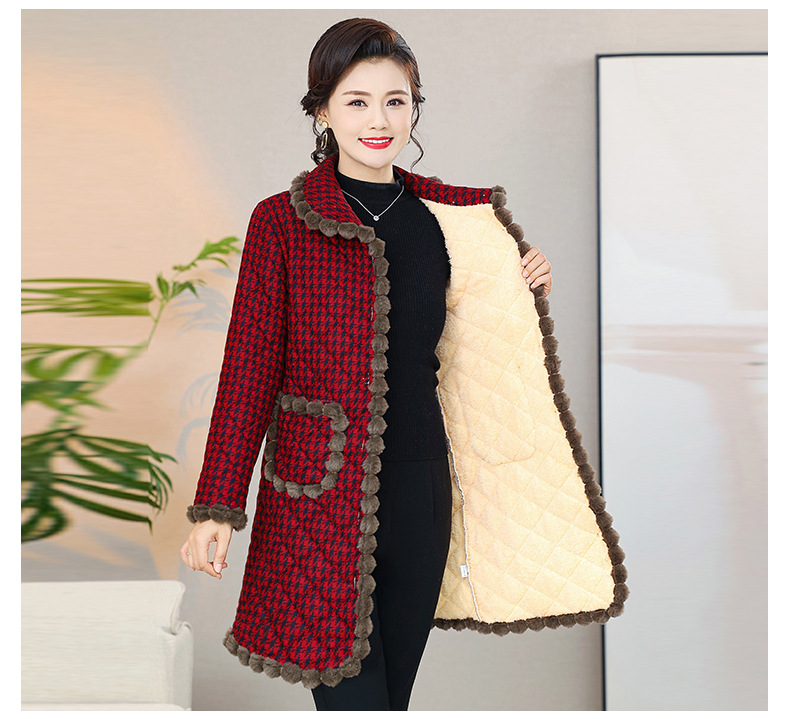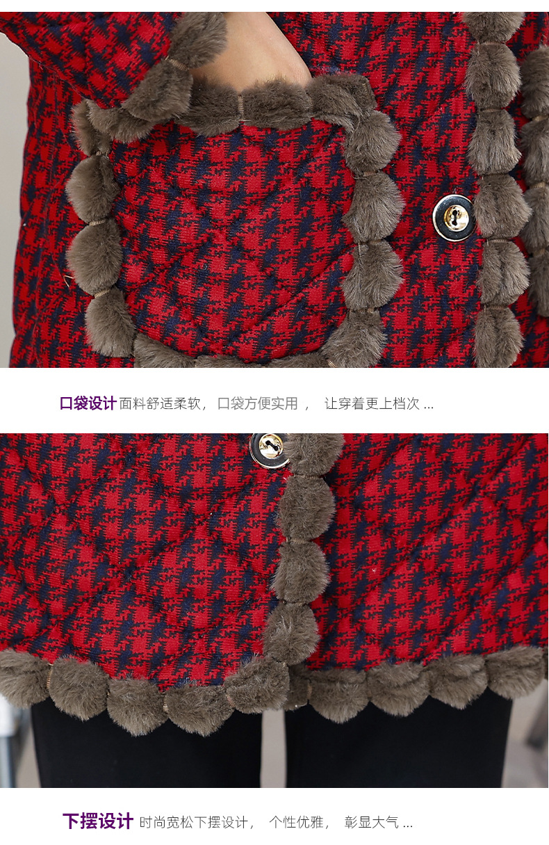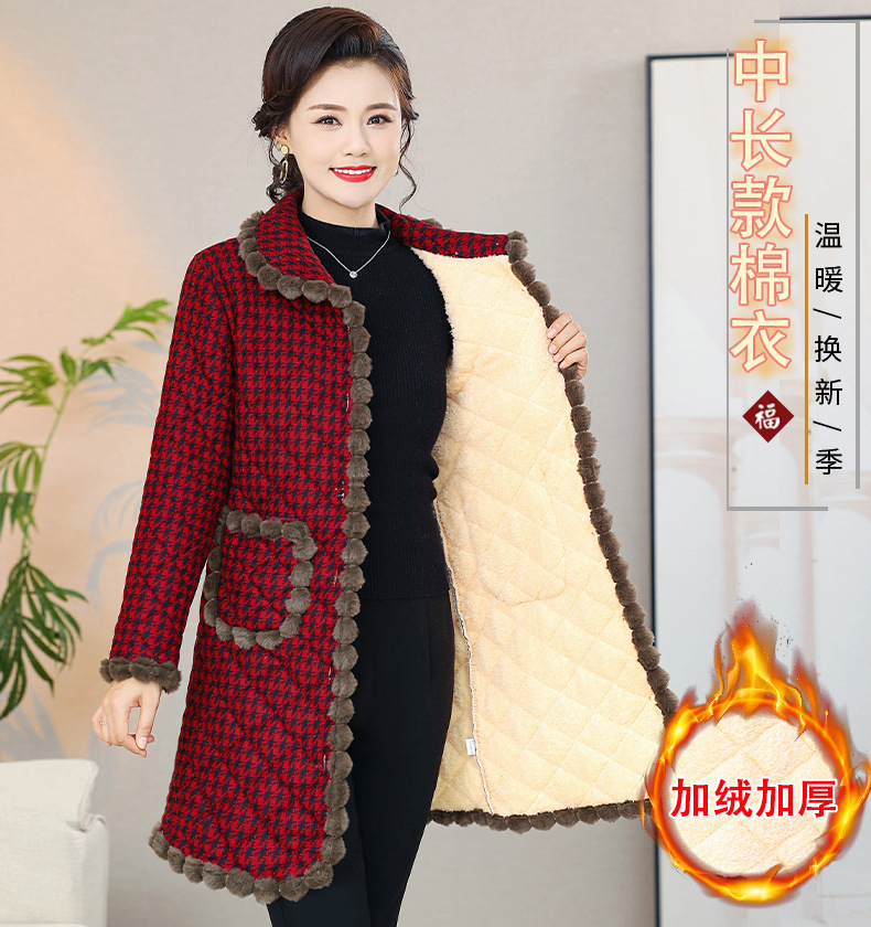 新款加绒大码中长款棉衣冬季棉服妈妈立领保暖加厚格子棉袄外套女