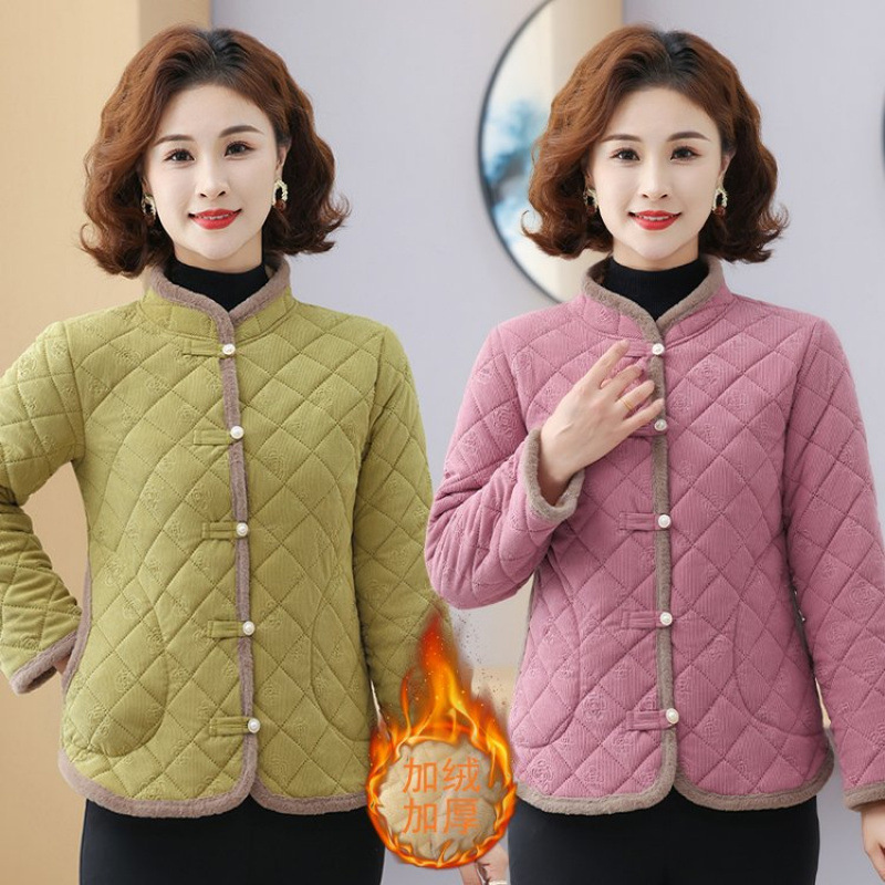 妈妈休闲减龄洋气毛边大码棉服外套中老年秋冬盘扣保暖轻薄款棉衣
