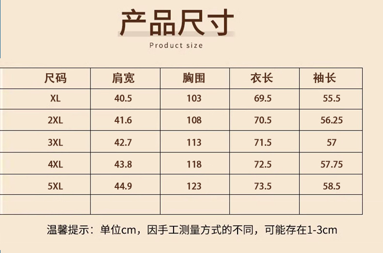 尺码 1XL【建议80-100斤】,2XL【建议105-120斤】,3XL【建议125-135斤】,4XL【建议135-145斤】,5XL【建议150-160斤】