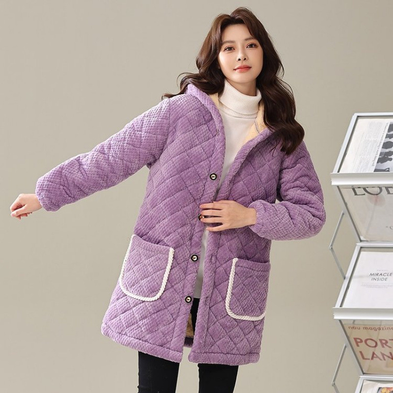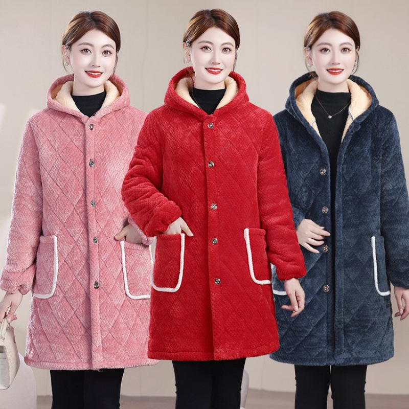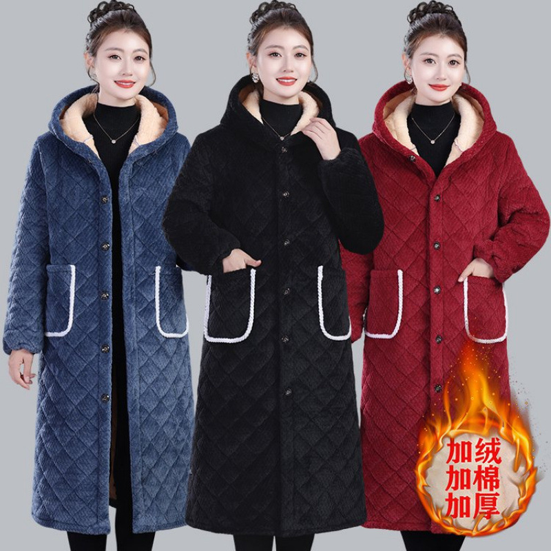 中老年女装冬季家居服保暖棉服加绒加厚棉衣休闲大褂加长过膝罩衣