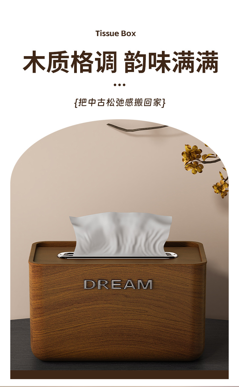 胡桃木纹新中式纸巾盒客厅餐桌办公室桌面高档抽纸盒中古风收纳盒