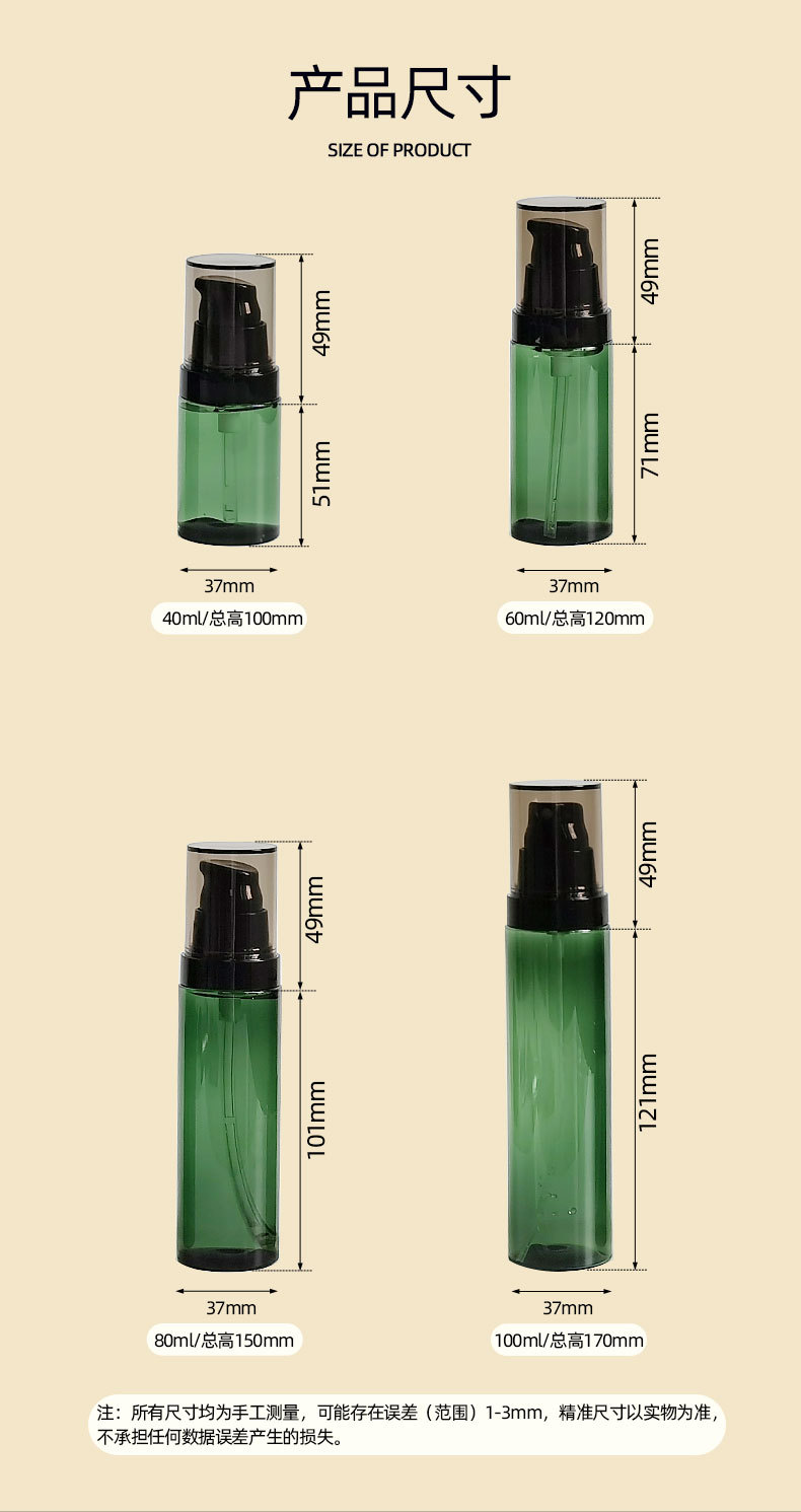现货40ml乳液按压瓶60ml透绿色PET塑料分装瓶100ml细雾定妆喷雾瓶