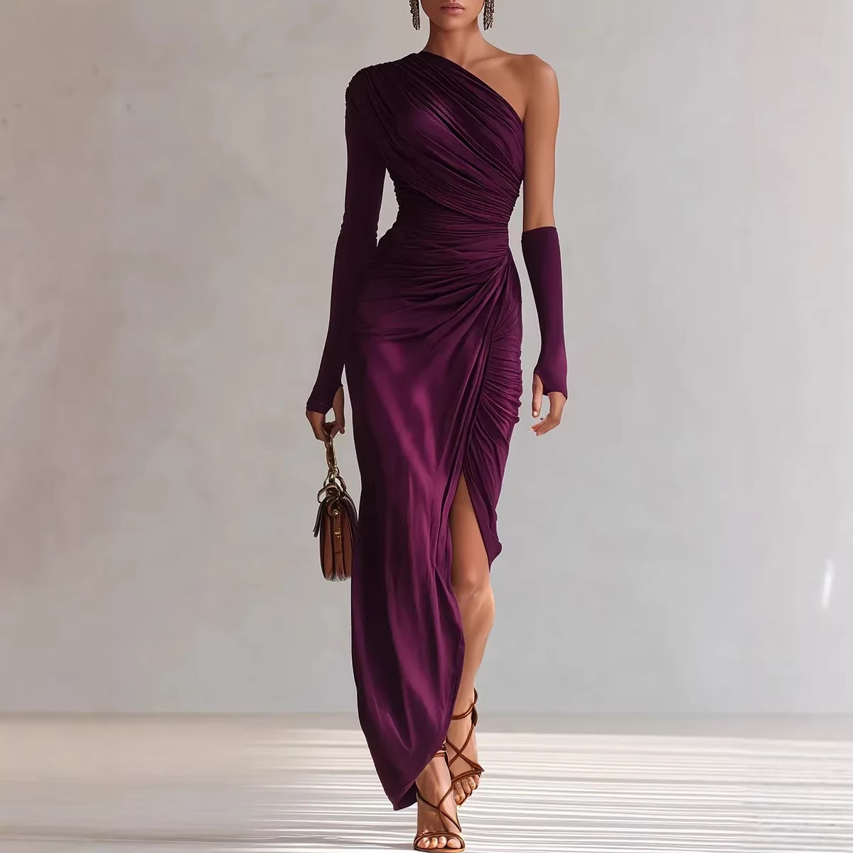 2026春季新款亚马逊跨境斜肩褶皱长裙女设计感收腰修身包臀连衣裙
