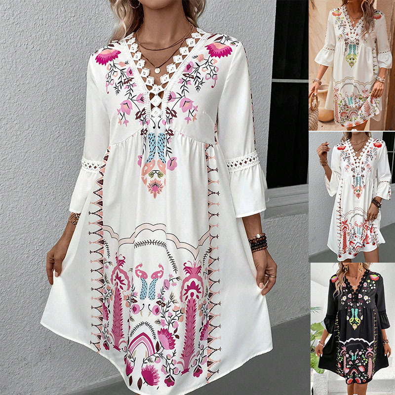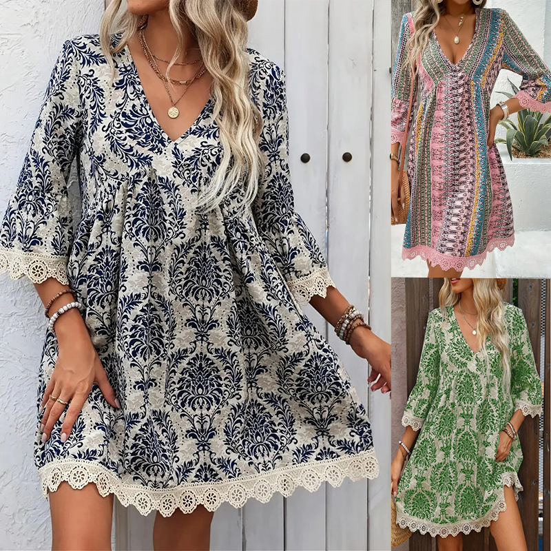2025欧美外贸时尚新款亚马逊WISH印花V领蕾丝花边七分袖连衣裙