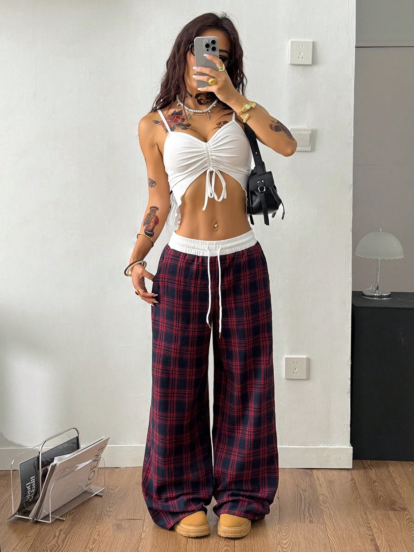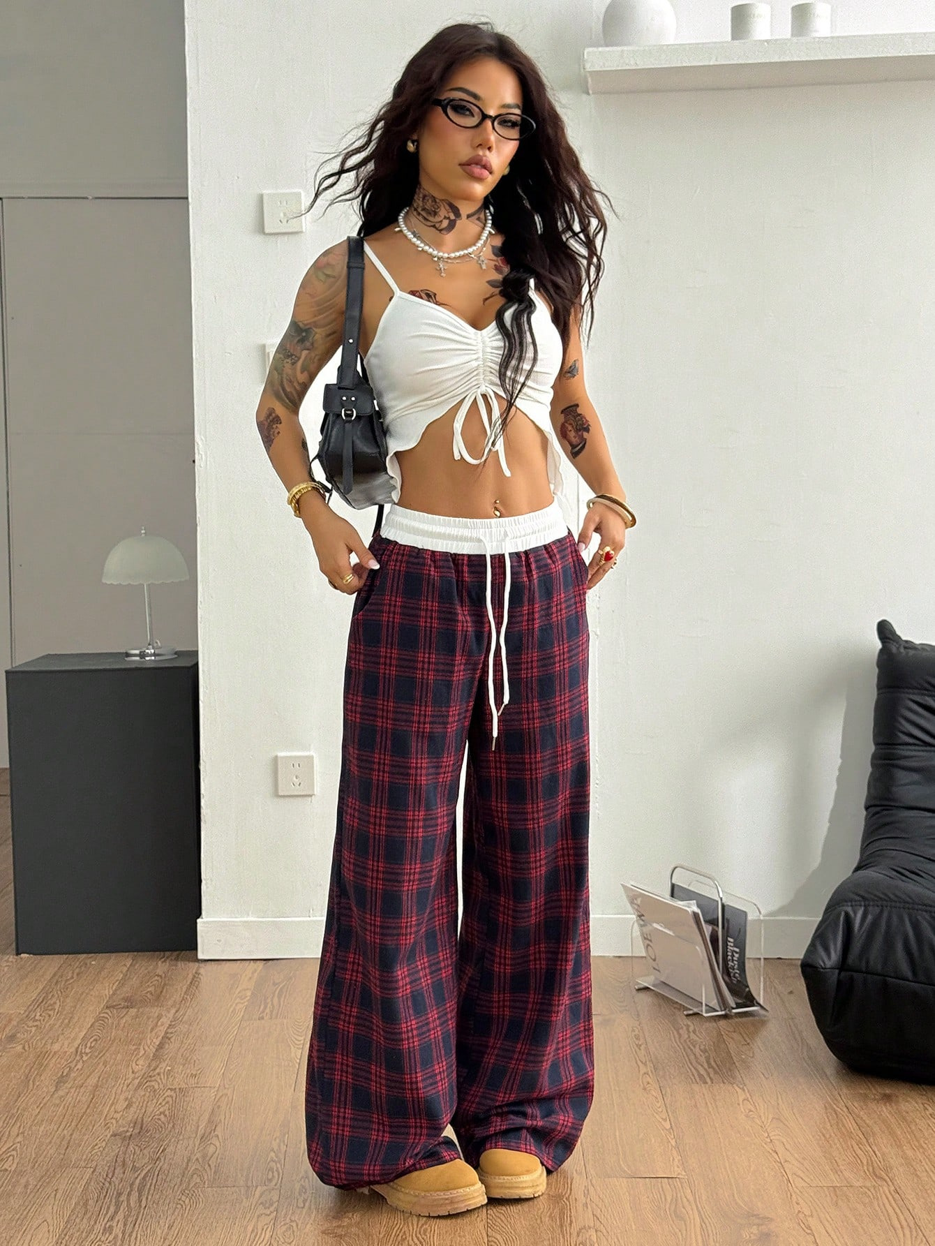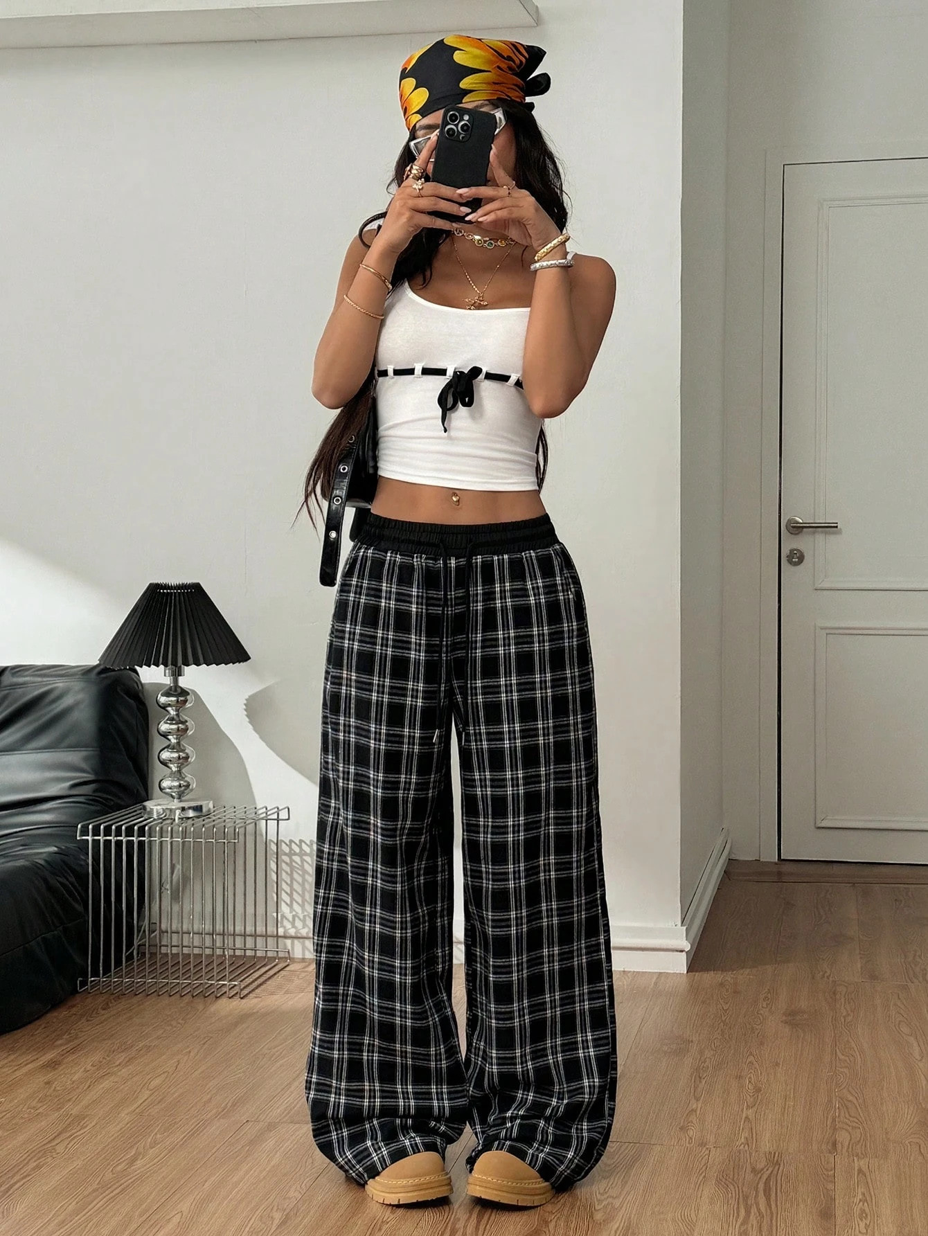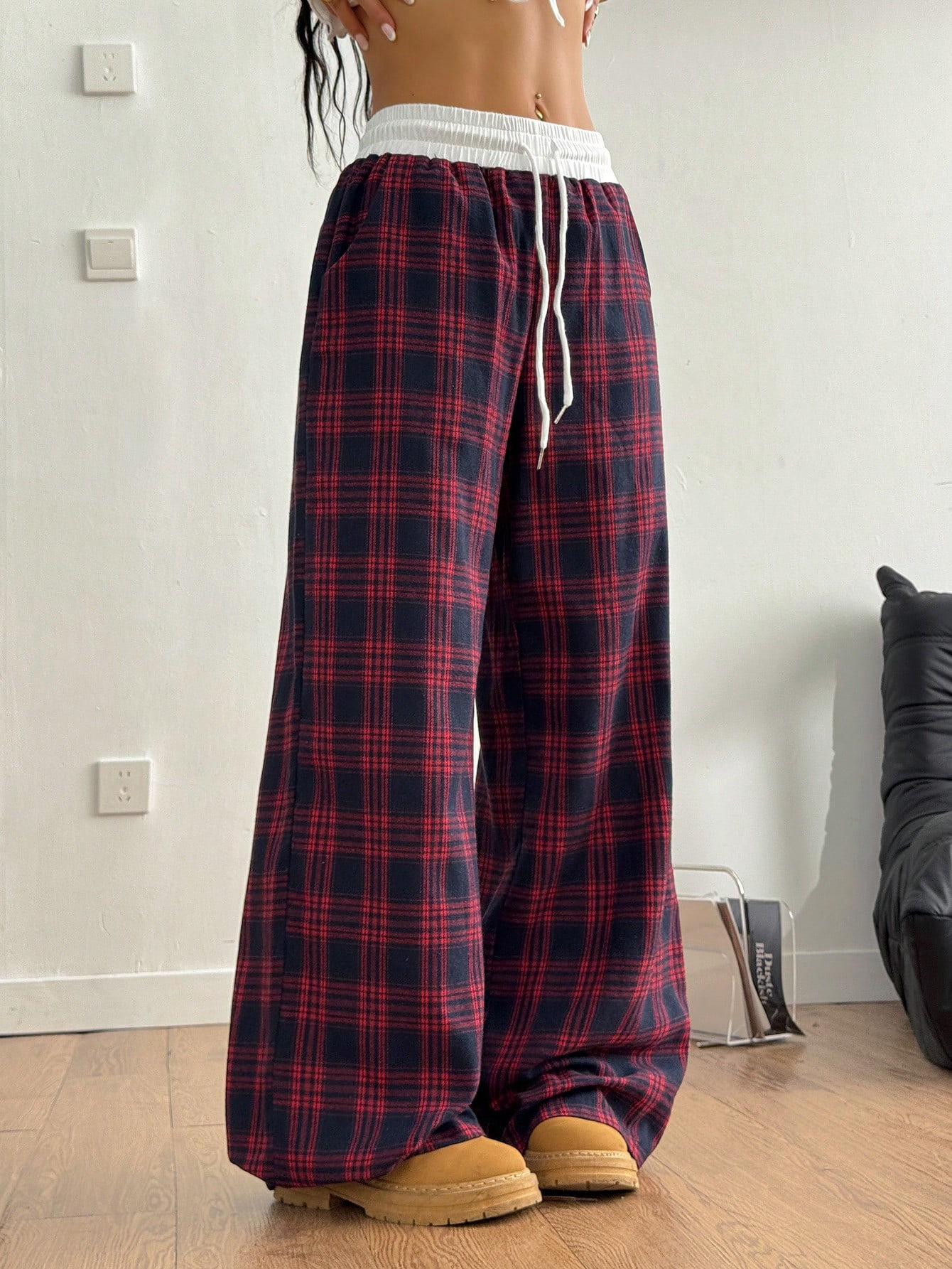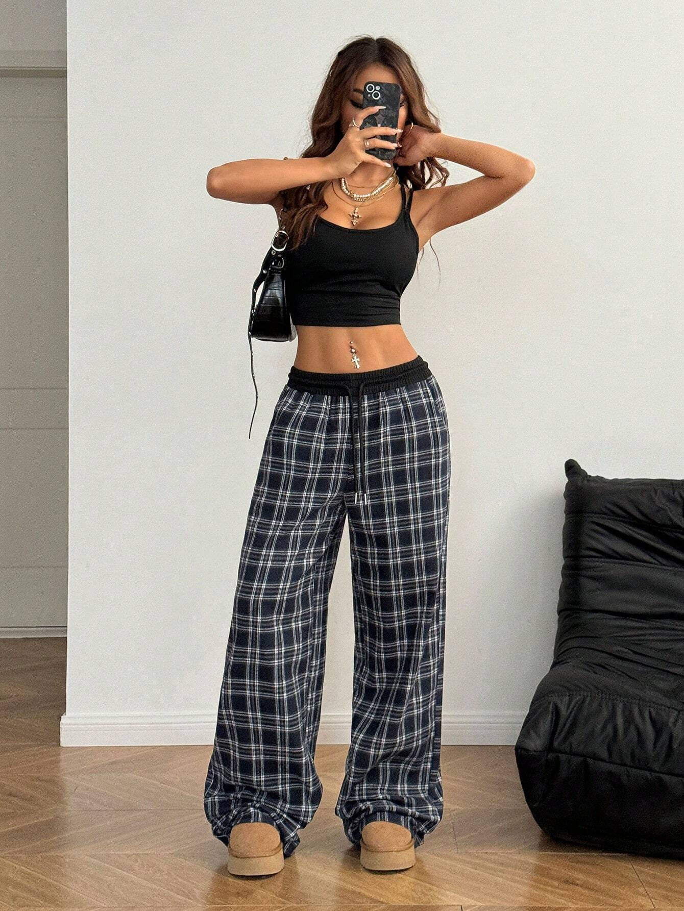 复古慵懒风拖地垂感阔腿格子裤 美式松紧腰百搭舒适直筒休闲裤