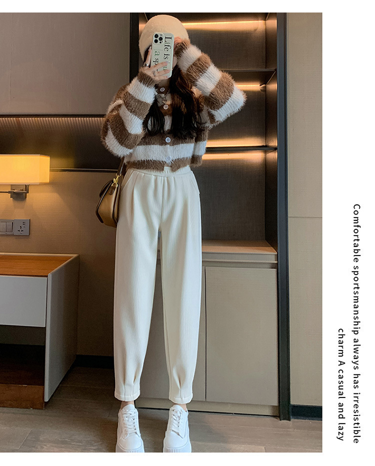 2024秋冬スタイルのベルベットの厚いスポーツパンツの女性は暖かくてゆったりしていて、やせている足のカジュアルパンツに合わせてハーレムパンツを着ています