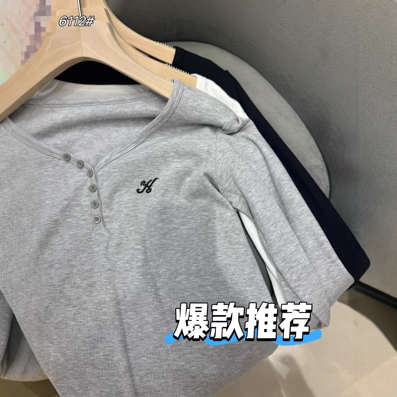 秋冬新款大码V领半排扣长袖打底衫女磨毛宽松舒适刺绣上衣女批发