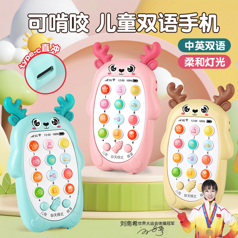 婴儿双语手机早教儿童卡通仿真手机可咬音乐故事电话机益智玩具