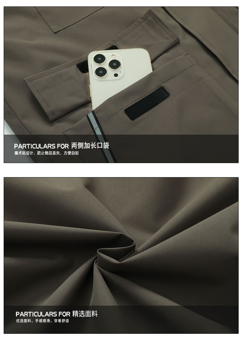 春と秋のシーズンに適した男女兼用の防風・防水・防汚アウトドア作業服、ロゴプリント対応、ゆったりとした型。