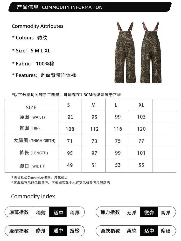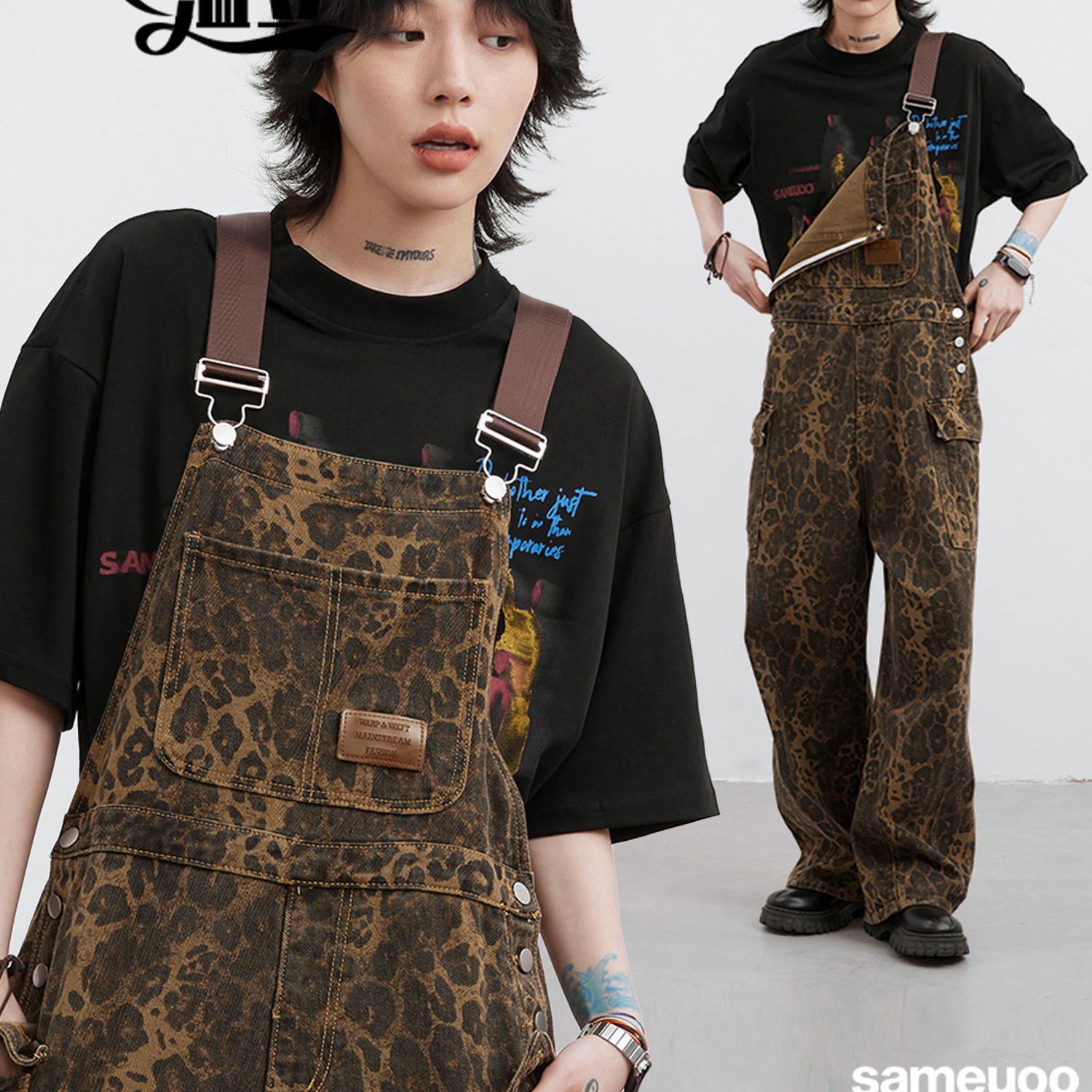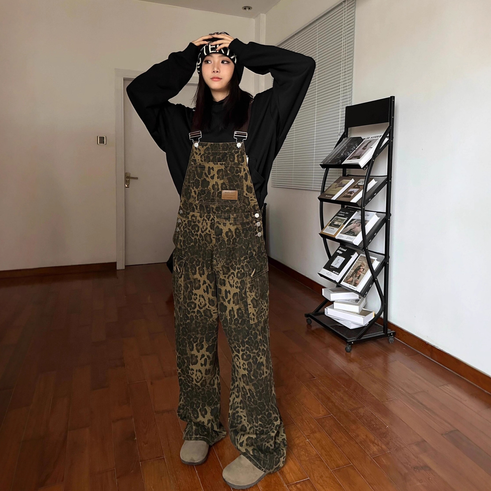 【韩牛】美式复古高街豹纹牛仔背带裤女宽松设计感小众直筒背带裤