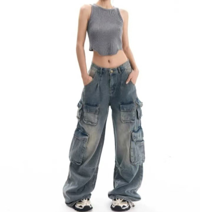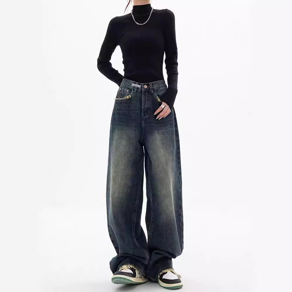 アメリカ式2024新型高街布水洗いは痩せたジーンズのレトロなmmがゆったりしていて、腰が高くて、まっすぐに床を引きずっています。