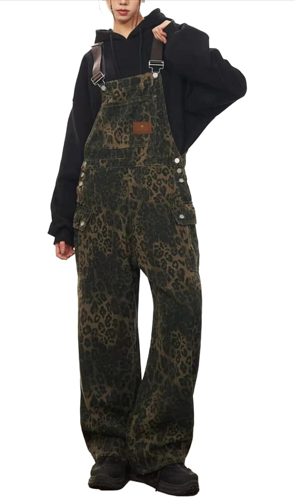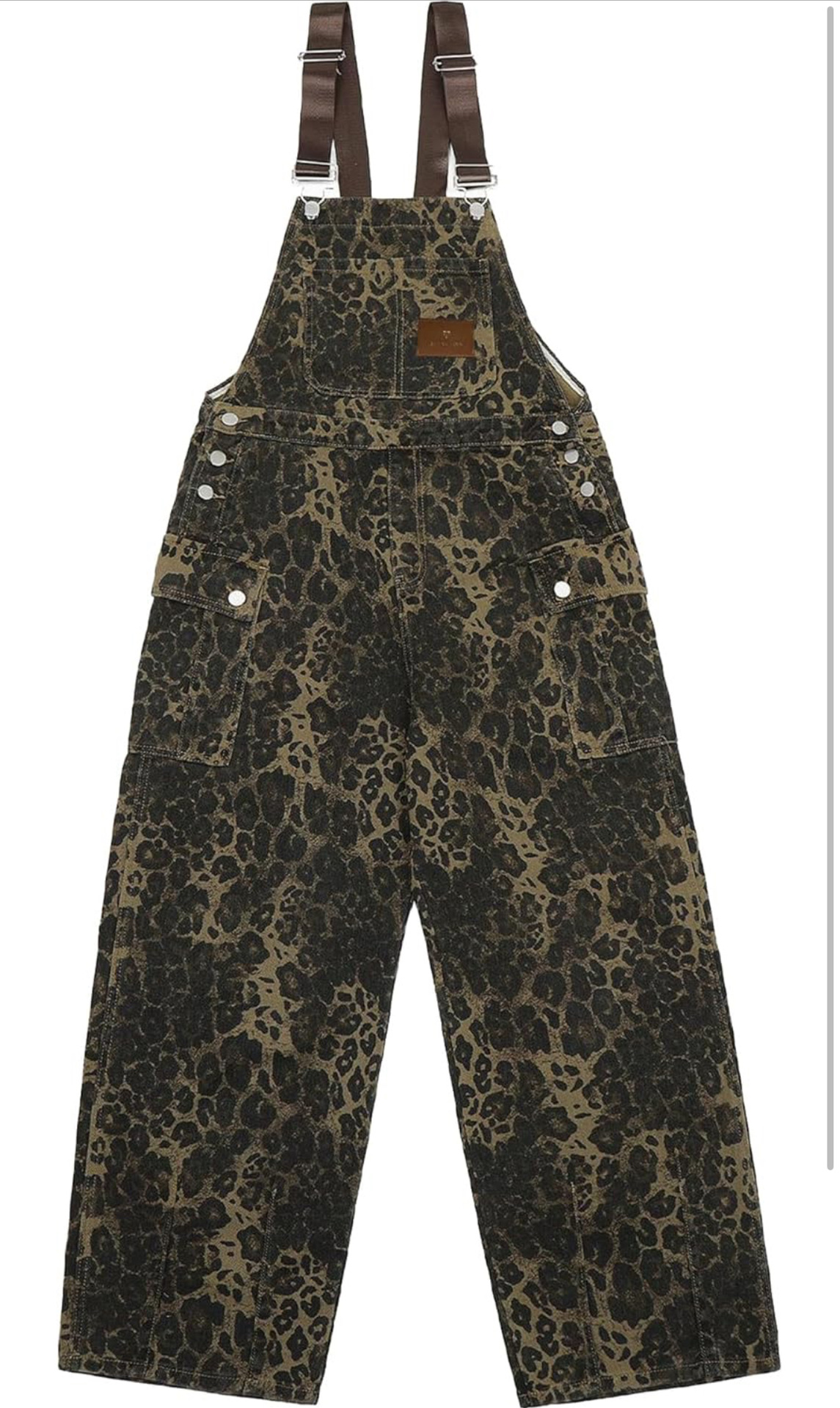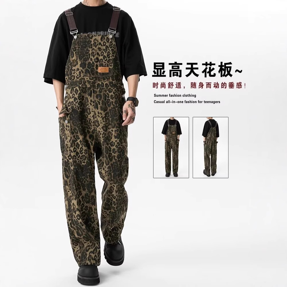 2025跨境亚马逊temu美式复古豹纹印花工装牛仔背带裤新款连体直筒