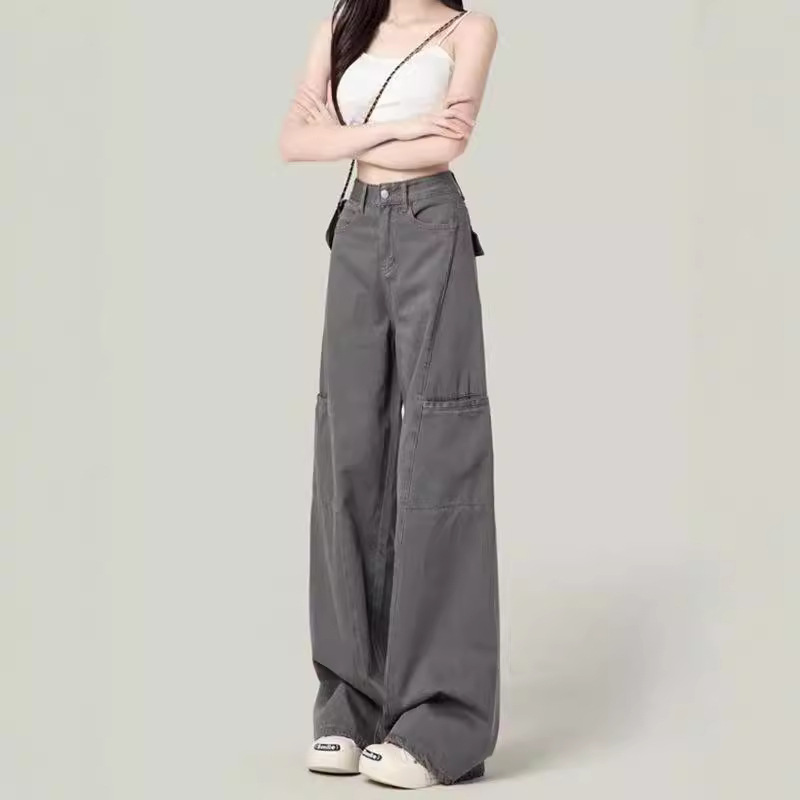 曲線の精巧な碧玉の端正な21セメントの灰色のアメリカの広足の工装のズボンの女性の2024の新型の復古の高い腰のまっすぐな筒