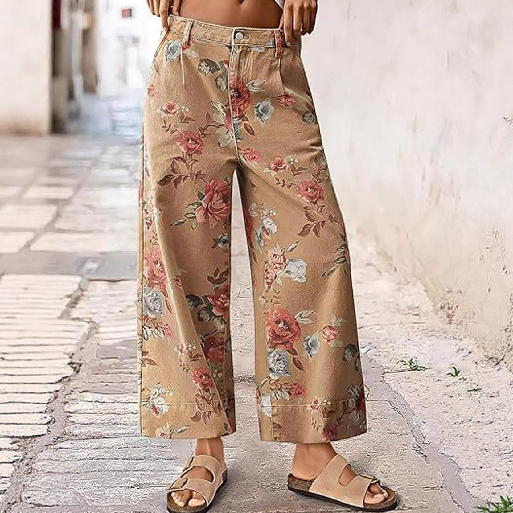 2025欧美新款女士中腰阔腿牛仔裤宽松花卉九分裤印花波西米亚风格