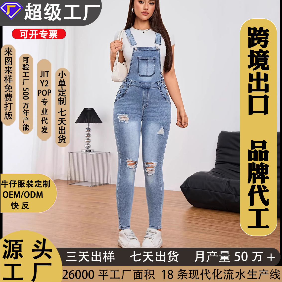 跨境欧美外贸热销女装时尚个性女式弹力修身牛仔破洞背带小脚裤