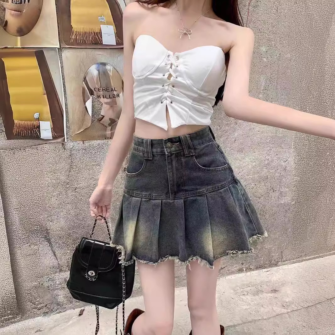 ギャルレトロ百シワデニムスカート女性2024新作夏ハイウエストa字防走光包尻ショートスカート