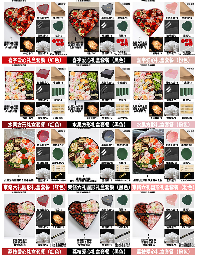 圆形礼盒套餐【黑色】送教程;见sku,圆形礼盒套餐【红色】送教程;见sku,圆形礼盒套餐【粉色】送教程;见sku,圆形开窗礼盒【黑色中号】;见sku,圆形开窗礼盒【红色中号】;见sku,圆形开窗礼盒【粉色大号】;见sku,圆形开窗礼盒【黑色中小套二】;见sku,圆形开窗礼盒【红色中小套二】;见sku,圆形开窗礼盒【粉色中小套二】;见sku,圆形开窗礼盒【黑色套三】;见sku,圆形开窗礼盒【红色套三】;见sku,圆形带提绳【黑色单个】;见sku,圆形带提绳防水盒【红色单个】;见sku,圆形带提绳【粉色单个】;见sku,圆形带提绳【黑色套二】;见sku,圆形带提绳【红色套二】;见sku,圆形带提绳【粉色套二】;见sku,圆形带提绳【黑色套三】;见sku,圆形带提绳【红色套三】;见sku,圆形带提绳【粉色套三】;见sku,心形礼盒套餐【黑色】送教程;见sku,心形礼盒套餐【红色】送教程;见sku,心形礼盒套餐【粉色】送教程;见sku,喜字爱心礼盒套餐【黑色】送教程;见sku,喜字爱心礼盒套餐【红色】送教程;见sku,喜字爱心礼盒套餐【粉色】送教程;见sku,心形开窗礼盒【黑色套二】;见sku,心形开窗礼盒【红色套二】;见sku,心形开窗礼盒【粉色套二】;见sku,心形开窗礼盒【黑色大号】;见sku,心形开窗礼盒【红色大号】;见sku,心形开窗礼盒【粉色大号】;见sku,方形礼盒套餐【黑色】送教程;见sku,方形礼盒套餐【红色】送教程;见sku,方形礼盒套餐【粉色】送教程;见sku,单个防水礼盒【方形大号黑色】;见sku,单个防水礼盒【方形大号红色】;见sku,单个防水礼盒【方形大号粉色】;见sku,水果寓意贴 90张/包;见sku,方形花泥2块装【插花必备】;见sku,圆形礼盒花泥【中号】;见sku,圆形礼盒花泥【大号】;见sku