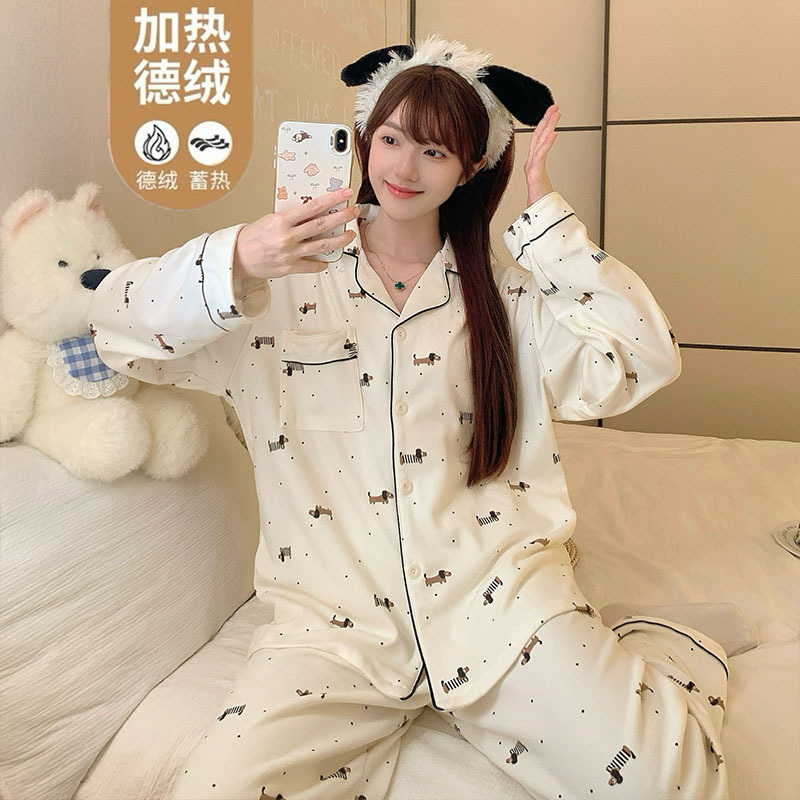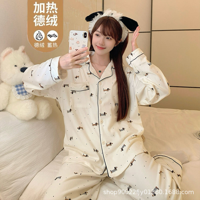 德绒睡衣女秋冬季加厚保暖珊瑚绒长袖2025新款高级感腊肠狗家居服