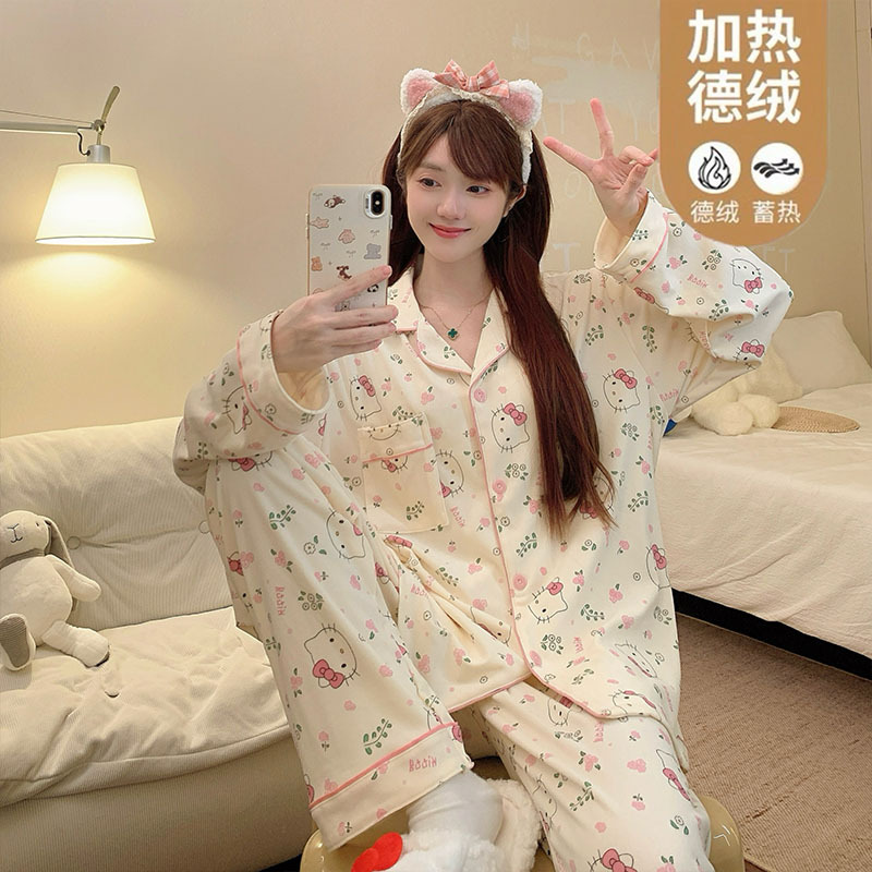 法兰绒睡衣女秋冬季保暖薄绒卡通学生开衫少女风珊瑚绒家居服套装