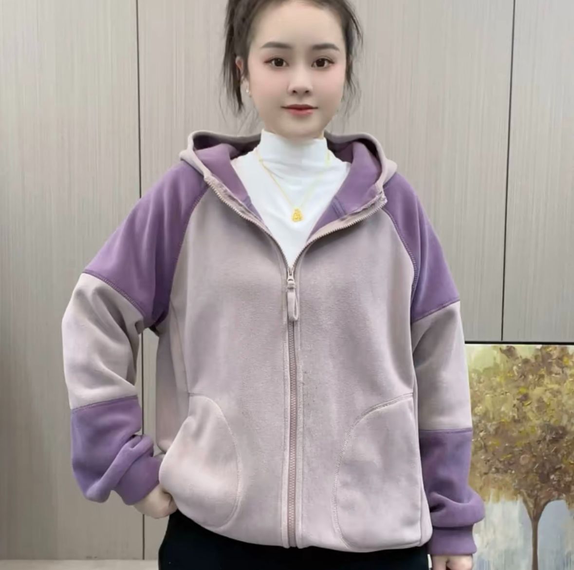 女装秋冬新款加厚保暖连帽拉链卫衣防风撞色百搭显瘦气质减龄绒衫