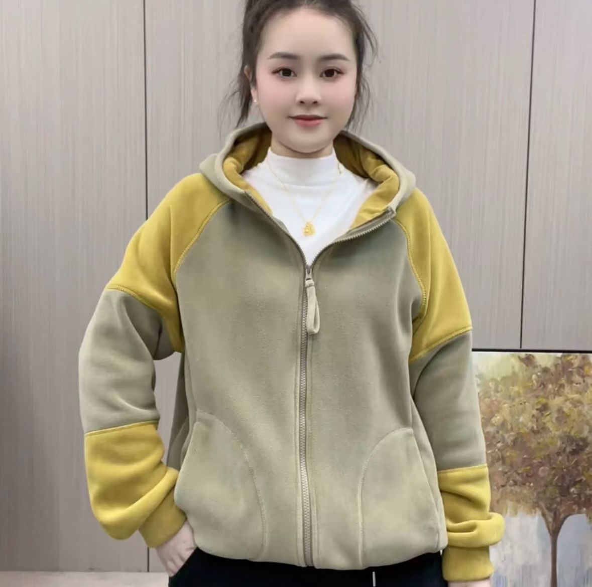 2025秋冬新款时尚休闲百搭双面澳粒绒保暖减龄撞色连帽长袖外套女