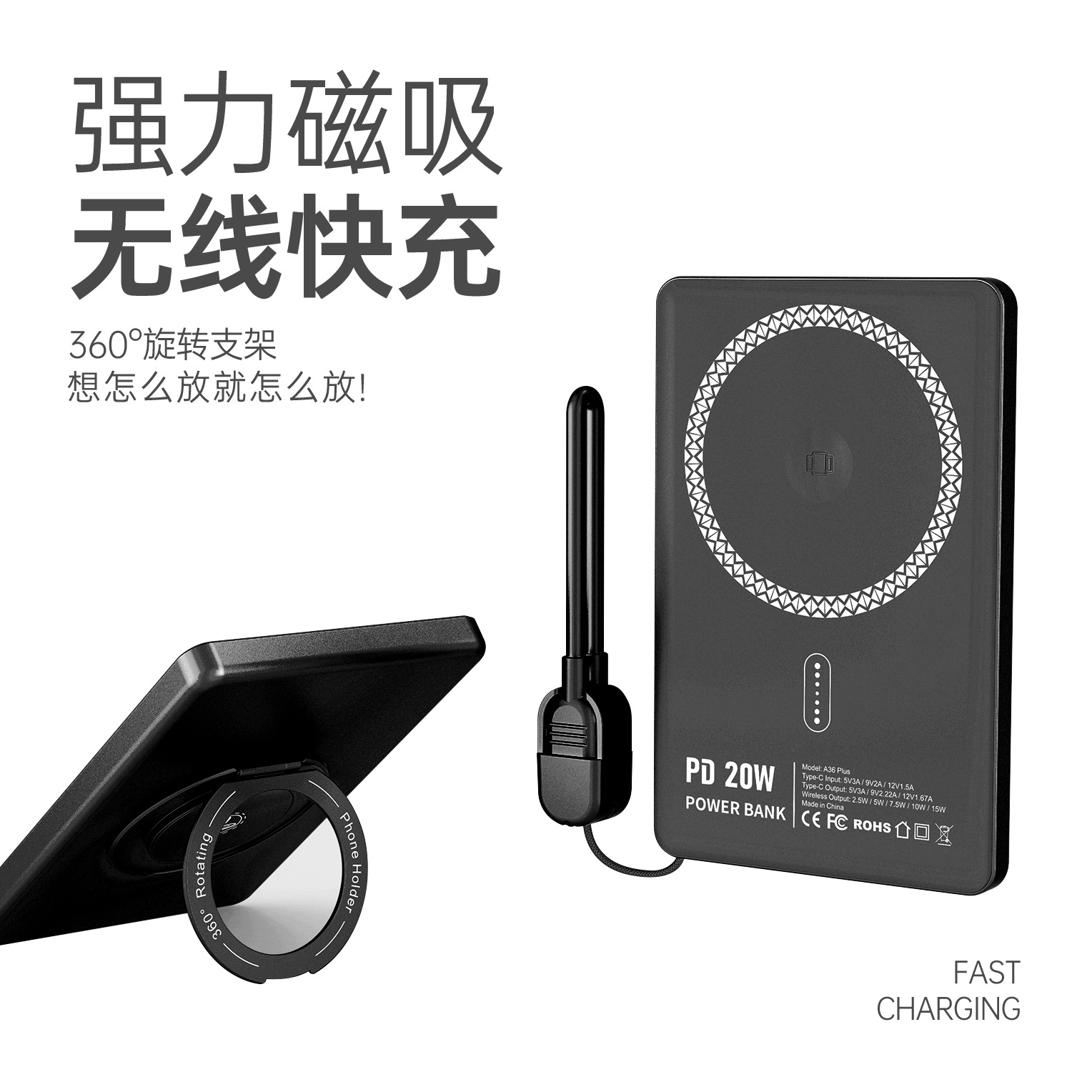 跨境磁吸无线充电宝5000毫安大容量360°支架挂绳PD20W快充充电宝